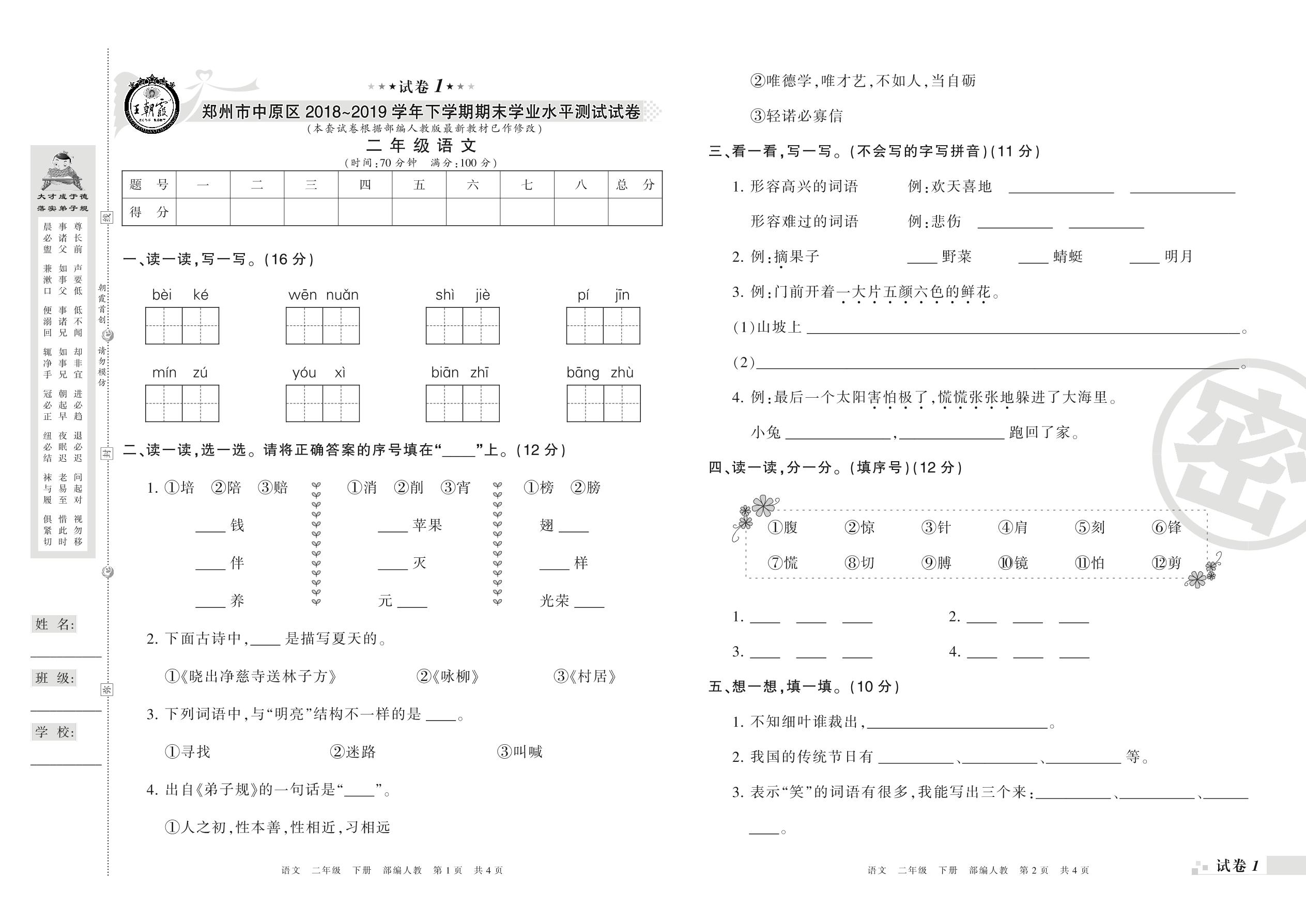 2018-2019学年第二学期郑州市中原区二年级语文试卷(人教版)【1】