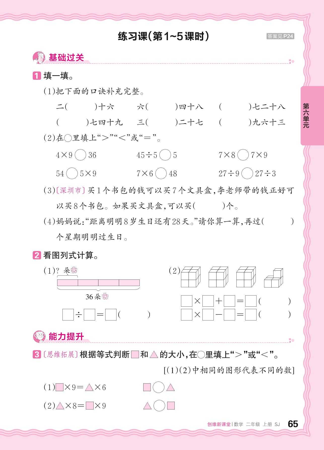 2024秋上册二年级数学苏教版 第六单元 表内乘法和表内除法(二)——7-9的乘法口诀及用乘法口诀求商练习课练习课
