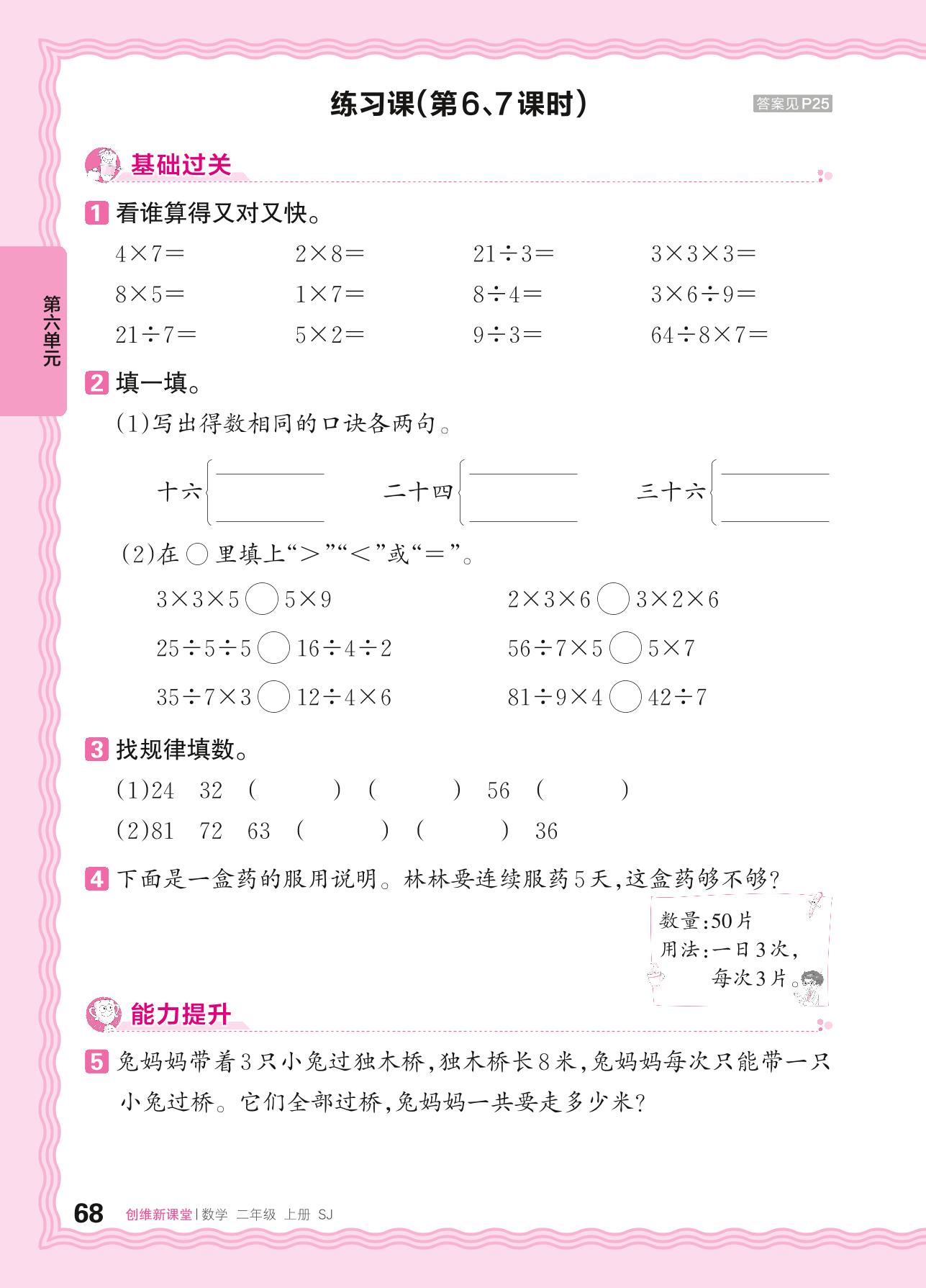 2024秋上册二年级数学苏教版 第六单元 表内乘法和表内除法(二)——乘法口诀表和连乘、连除和乘除混合运算练习课
