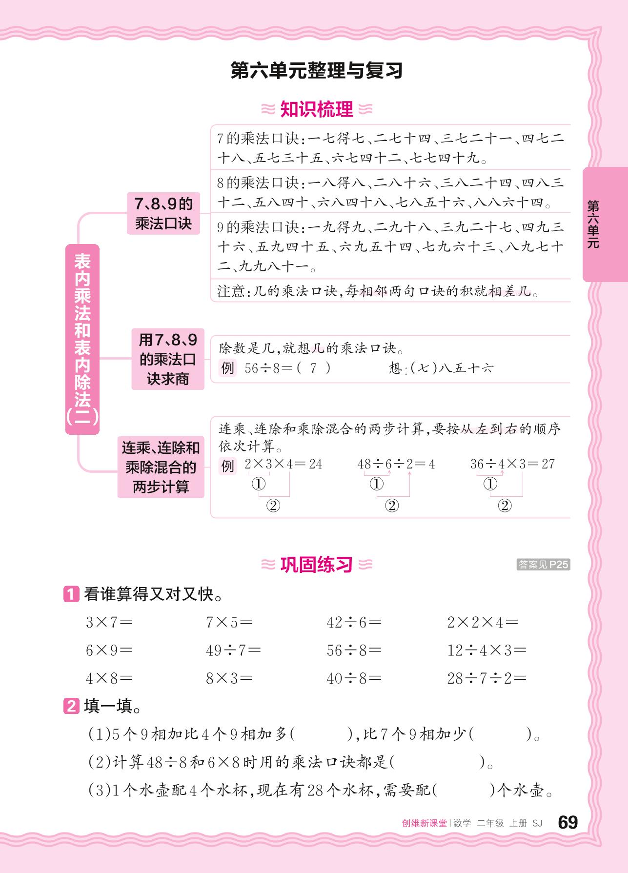 2024秋上册二年级数学苏教版 第六单元整理与复习