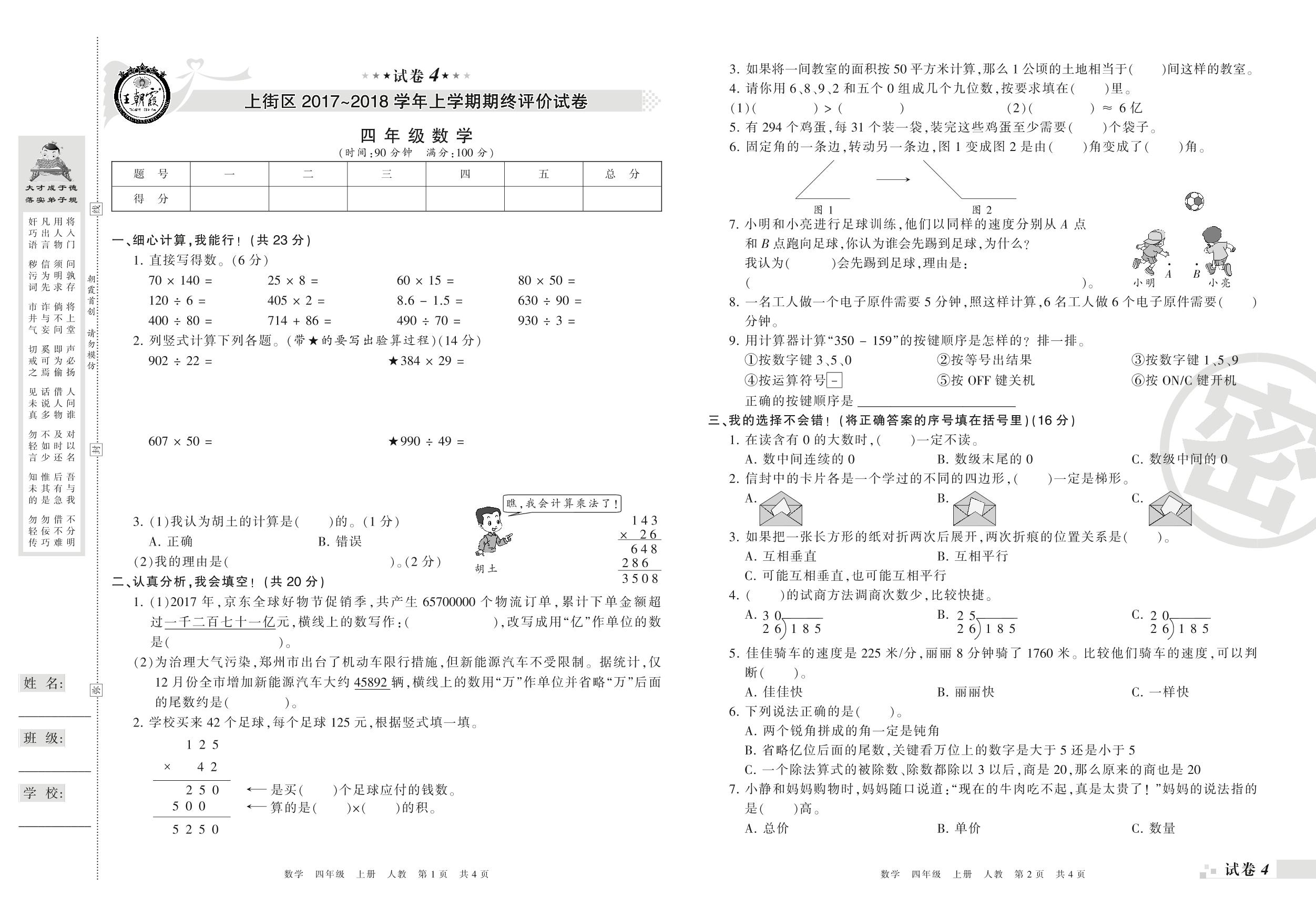 2017-2018学年第一学期郑州市上街区四年级数学试卷(人教版)【4】