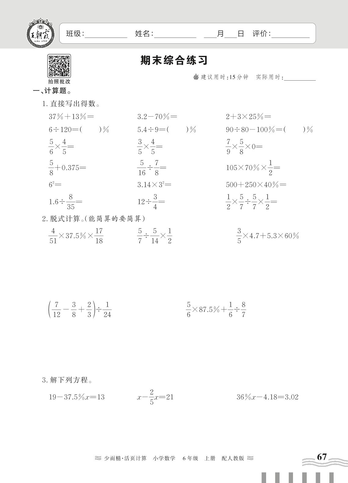 2024秋上册六年级数学人教版 期末综合练习(计算专练)