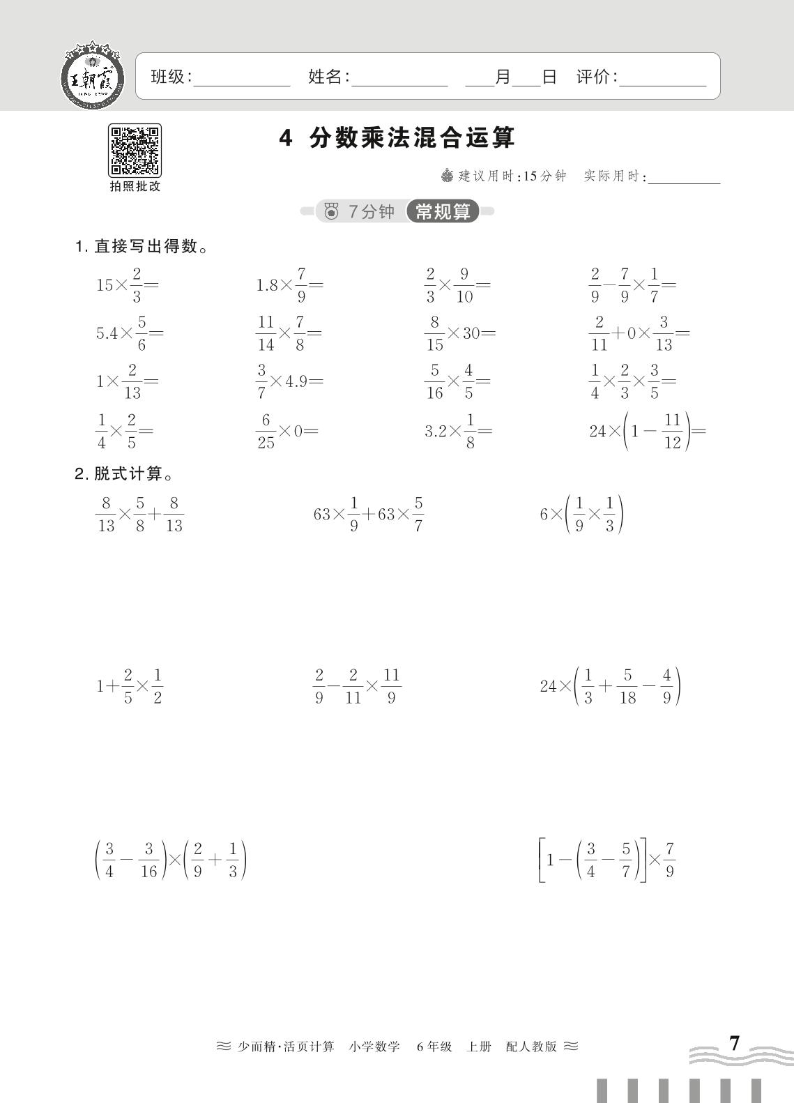 2024秋上册六年级数学人教版 第一单元 分数乘法——4. 分数乘法混合运算