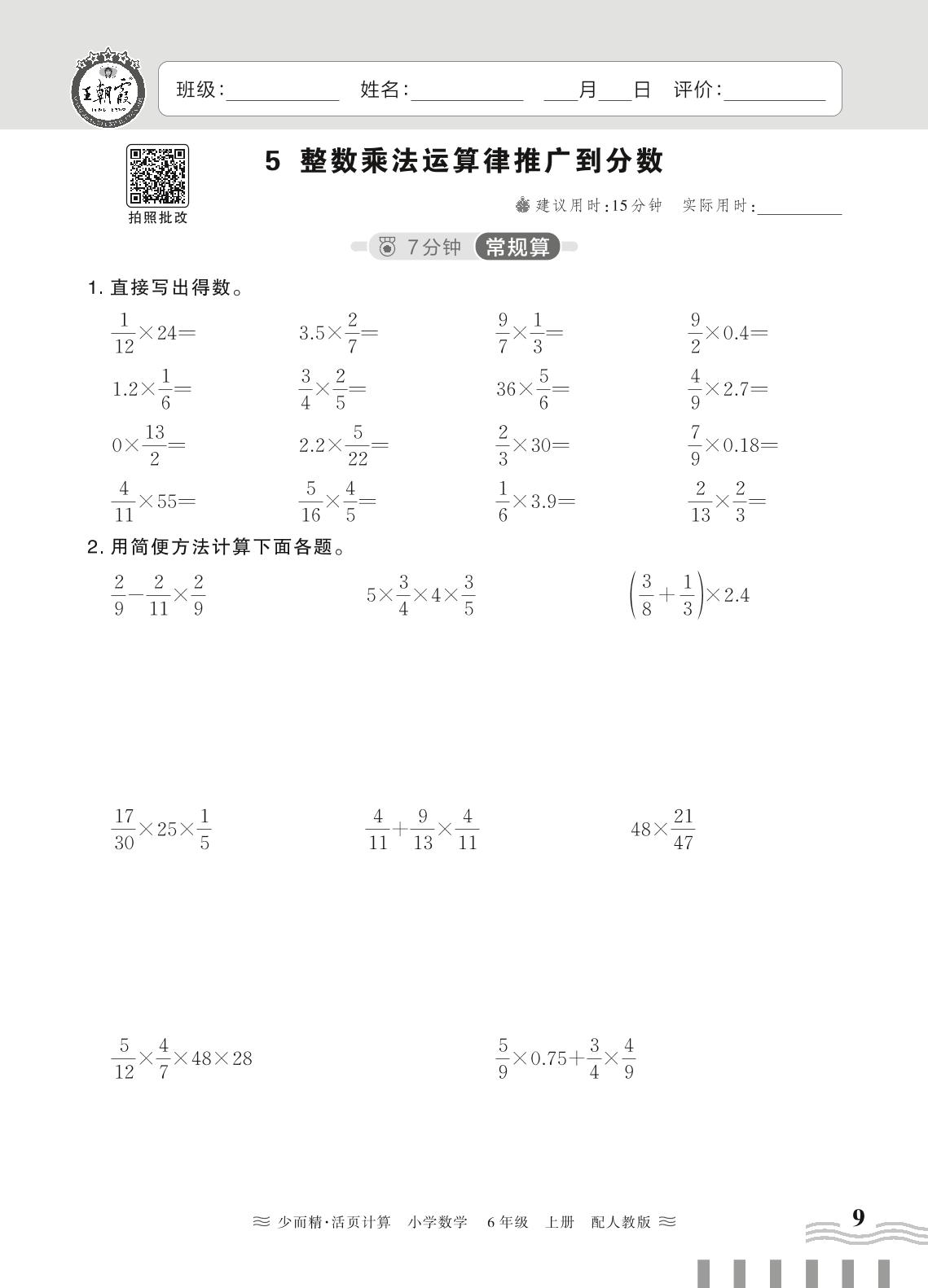 2024秋上册六年级数学人教版 第一单元 分数乘法——5. 整数乘法运算律推广到分数