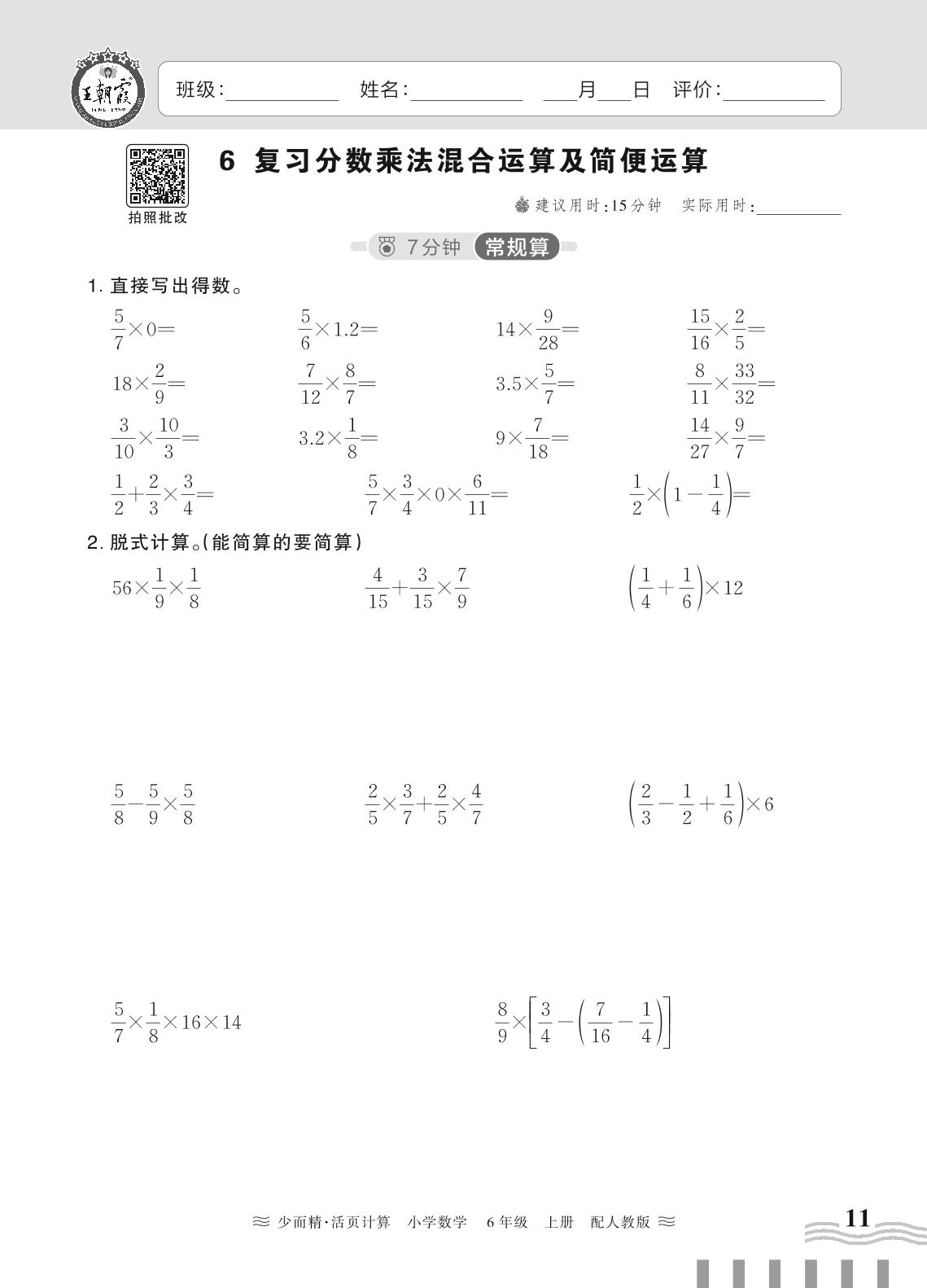2024秋上册六年级数学人教版 第一单元 分数乘法——6. 复习分数乘法混合运算及简便运算