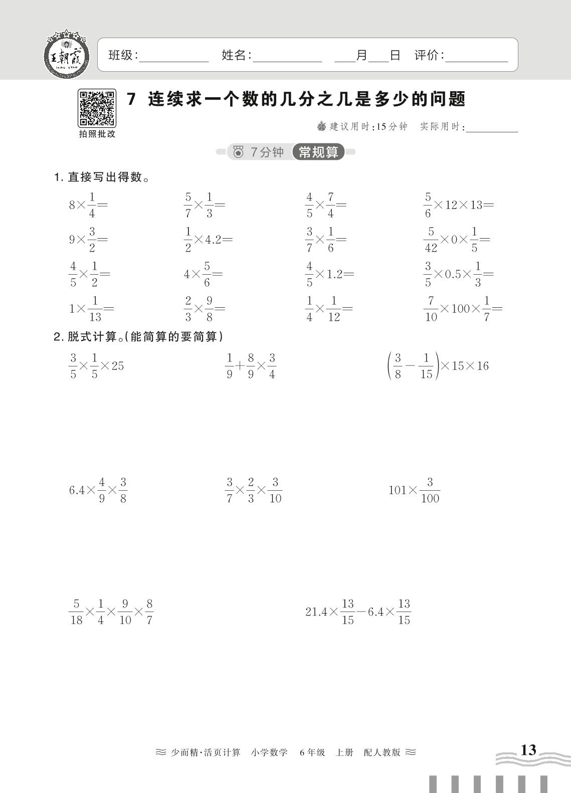 2024秋上册六年级数学人教版 第一单元 分数乘法——7. 连续求一个数的几分之几是多少的问题