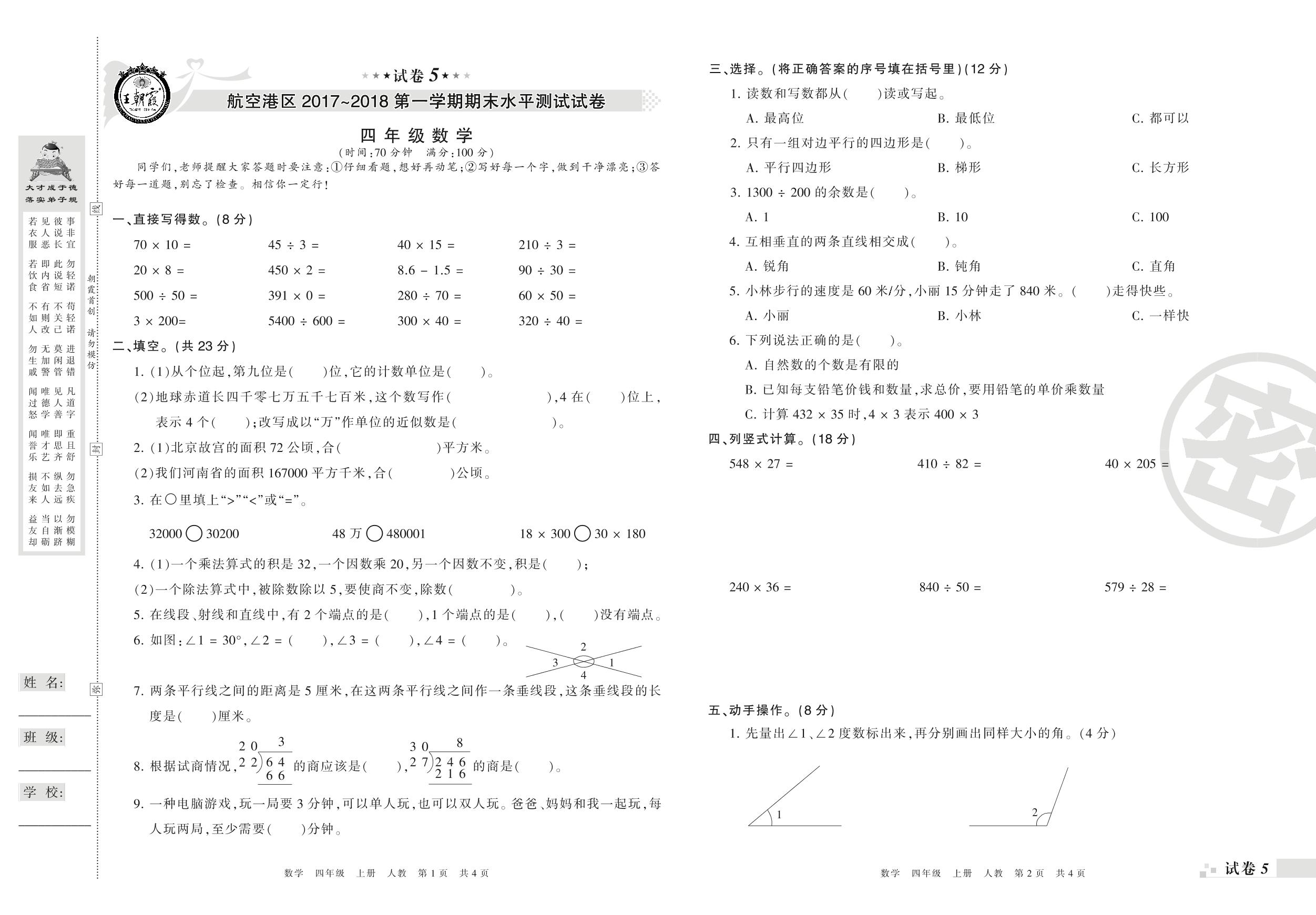 2017-2018学年第一学期郑州市航空城区四年级数学试卷(人教版)【5】