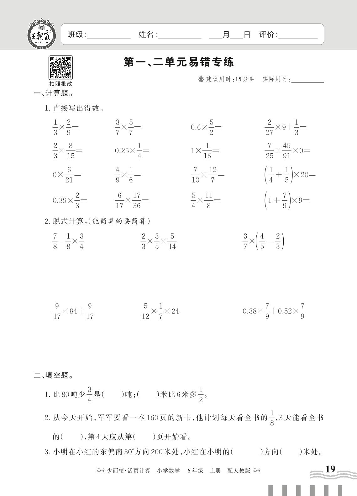 2024秋上册六年级数学人教版 第一、二单元易错专练