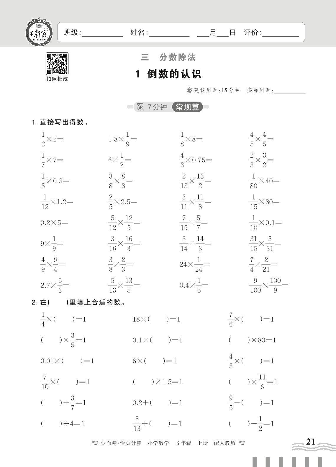 2024秋上册六年级数学人教版 第三单元 分数除法——1. 倒数的认识_R240819104455236