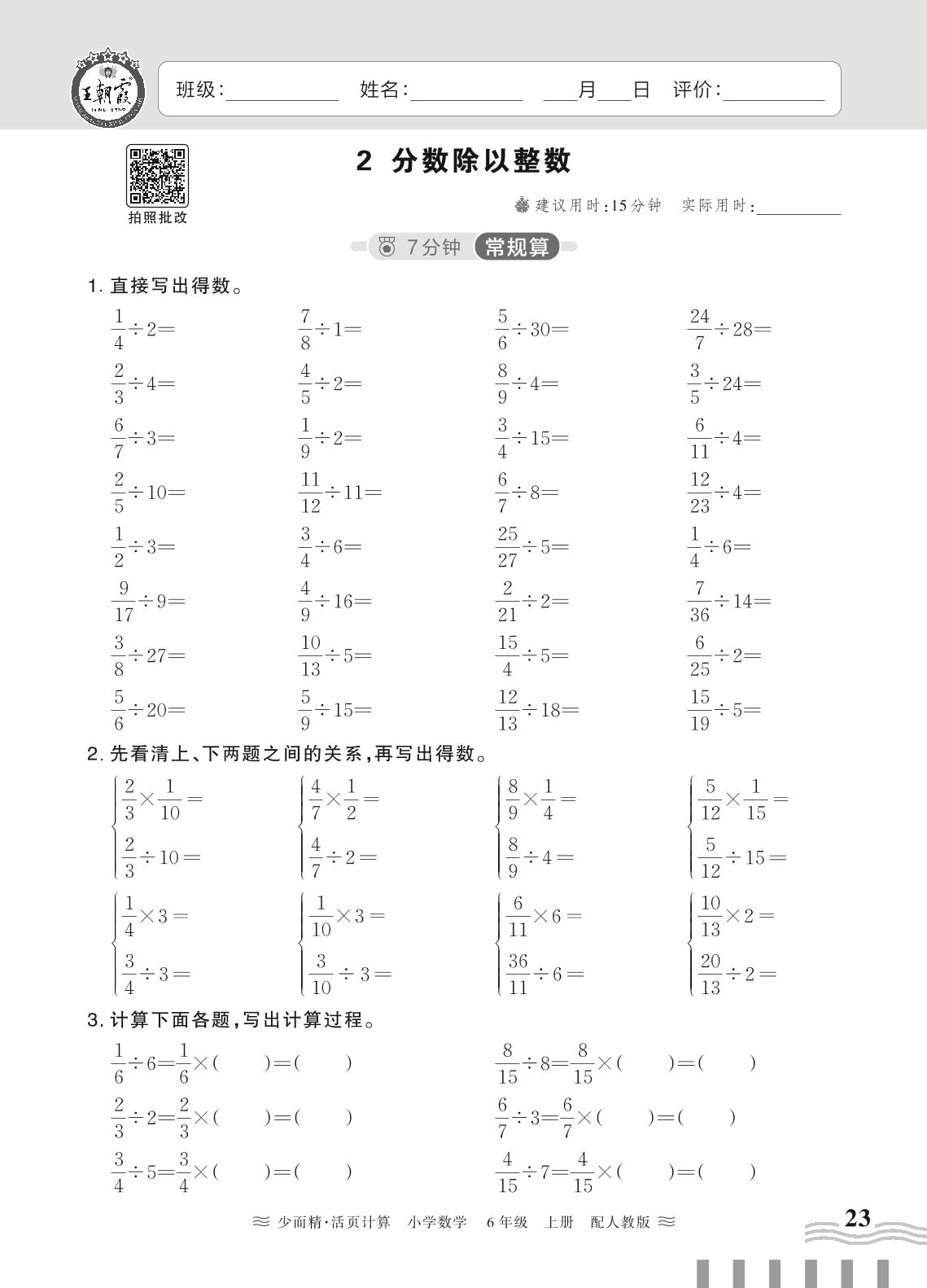 2024秋上册六年级数学人教版 第三单元 分数除法——2. 分数除以整数_R240819104456341