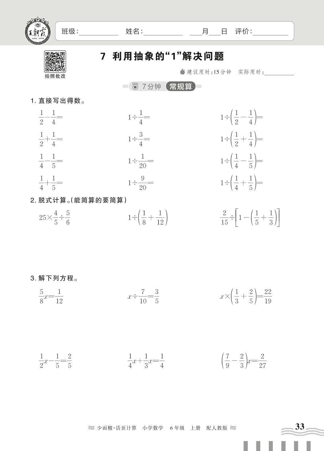 2024秋上册六年级数学人教版 第三单元 分数除法——7. 利用抽象的“1”解决问题