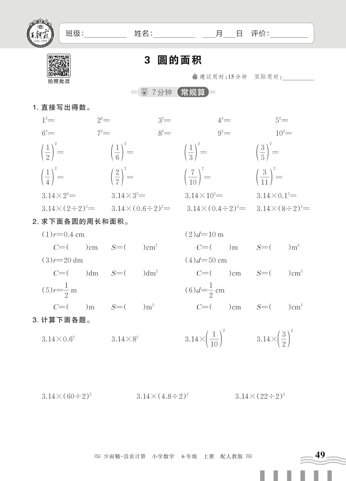 2024秋上册六年级数学人教版 第五单元 圆——3. 圆的面积