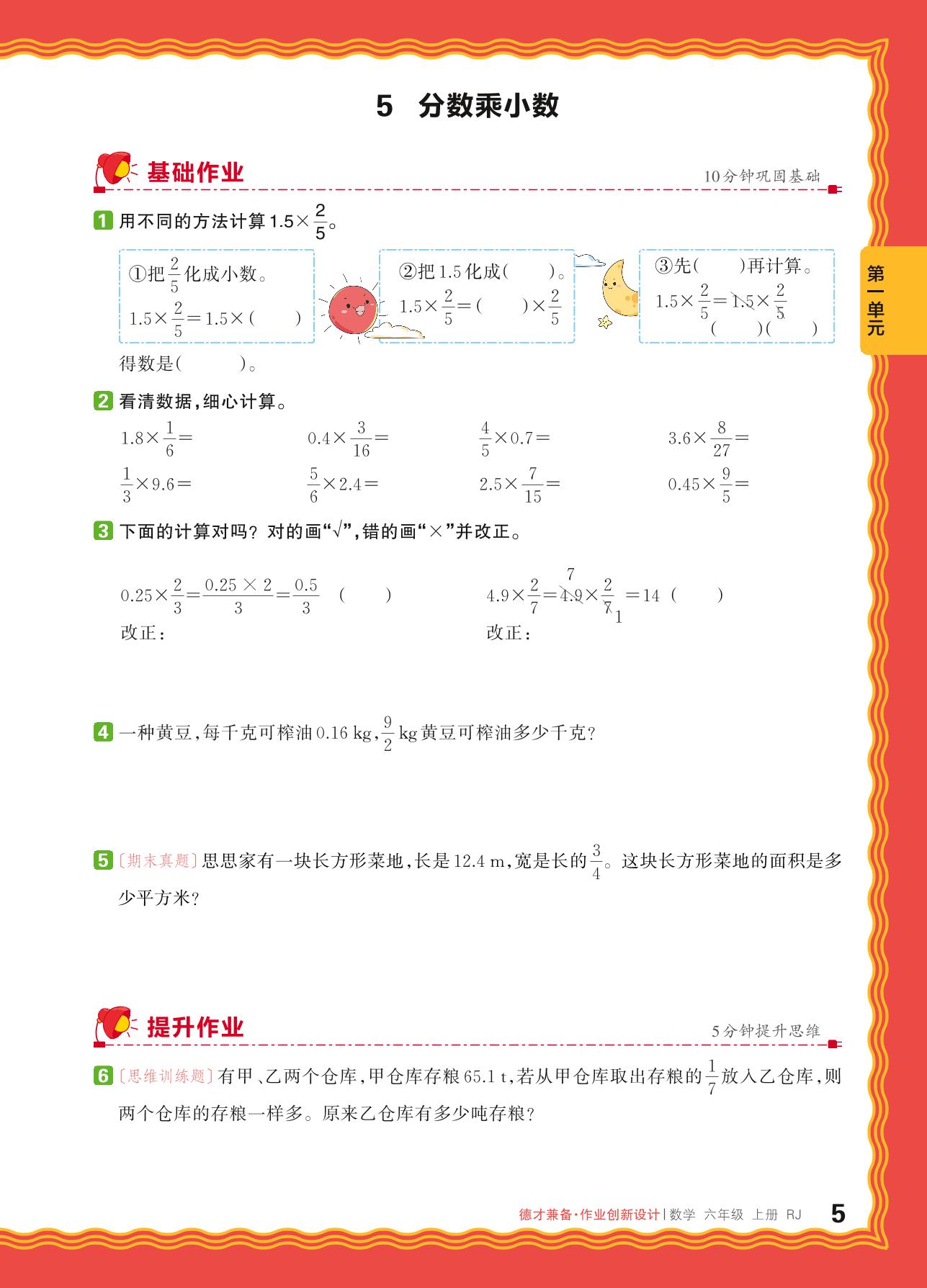 2024秋上册六年级数学人教版 第一单元 分数乘法——5. 分数乘小数_R240819104640559