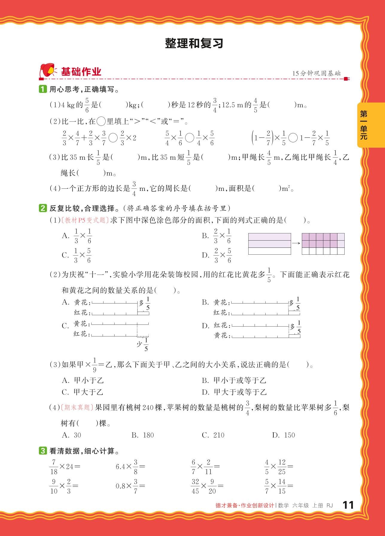 2024秋上册六年级数学人教版 第一单元 分数乘法——整理和复习