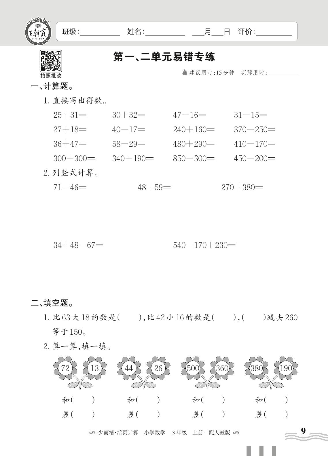 2024秋上册三年级数学人教版 第一、二单元易错专练
