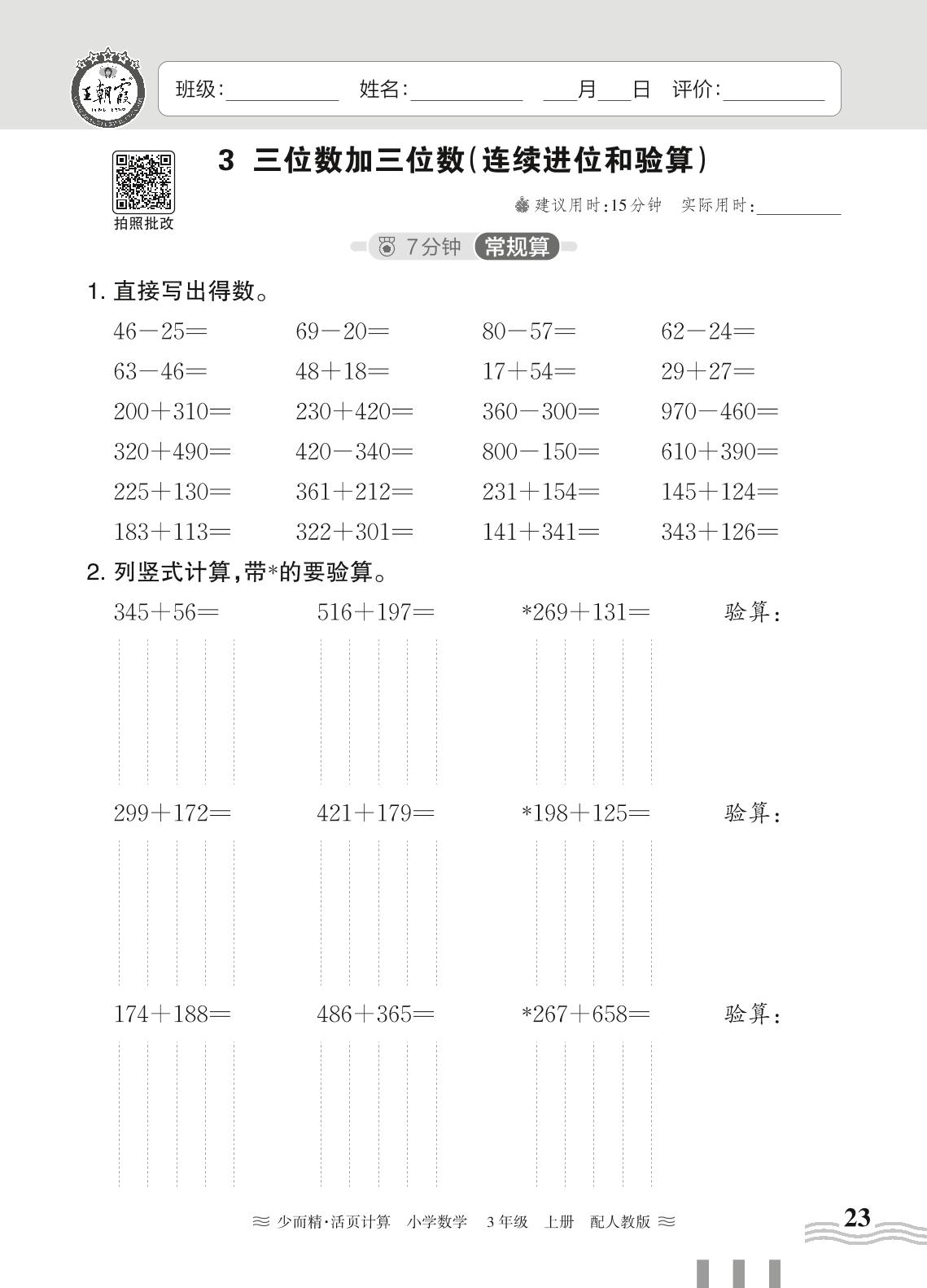 2024秋上册三年级数学人教版 第四单元 万以内的加法和减法(二)——3. 三位数加三位数(连续进位和验算)
