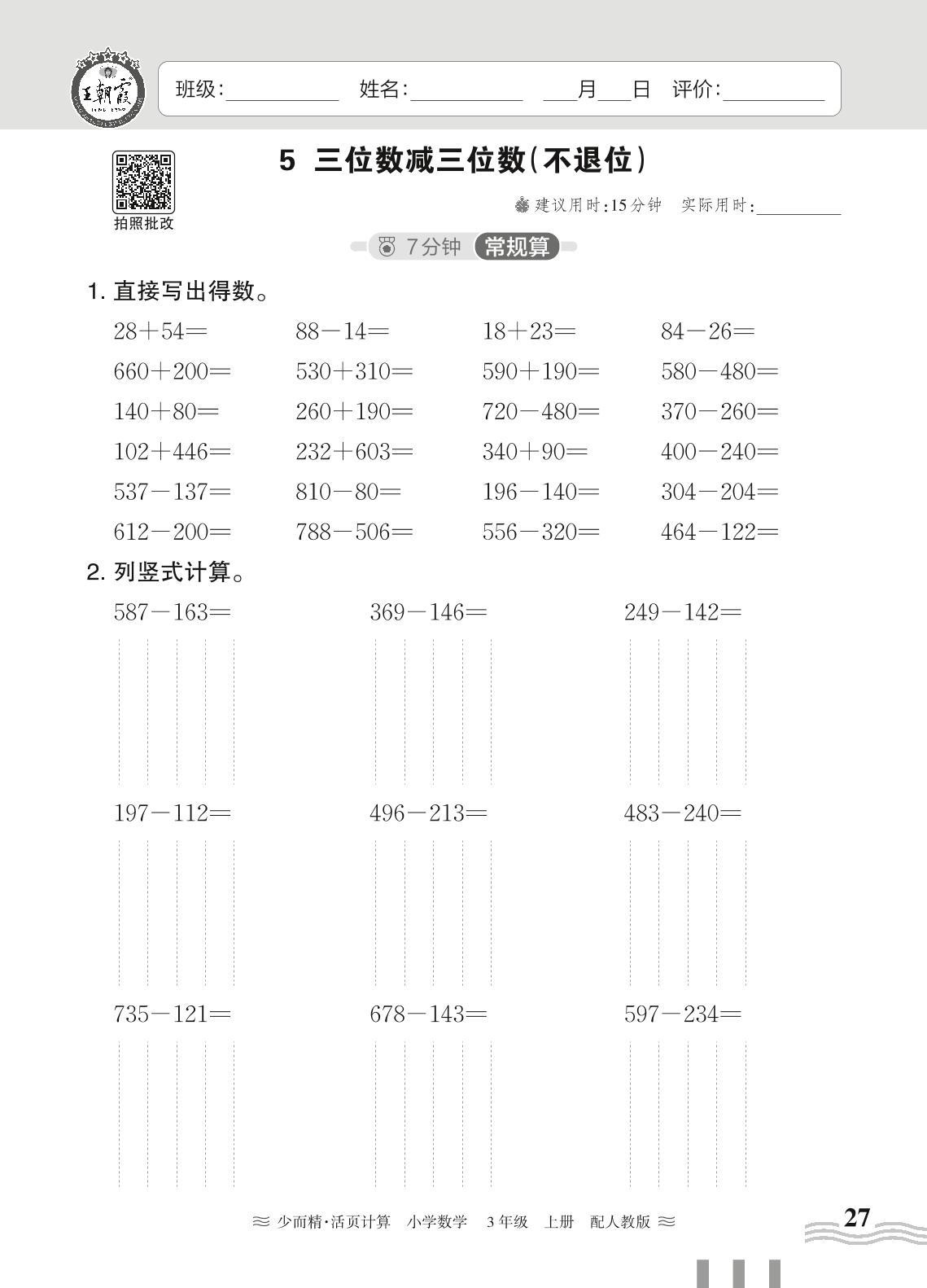 2024秋上册三年级数学人教版 第四单元 万以内的加法和减法(二)——5. 三位数减三位数(不退位)