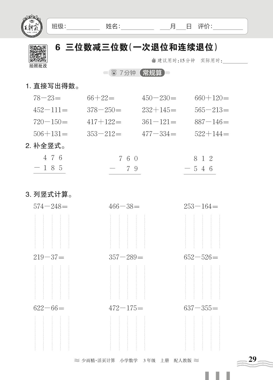 2024秋上册三年级数学人教版 第四单元 万以内的加法和减法(二)——6. 三位数减三位数(一次退位和连续退位)