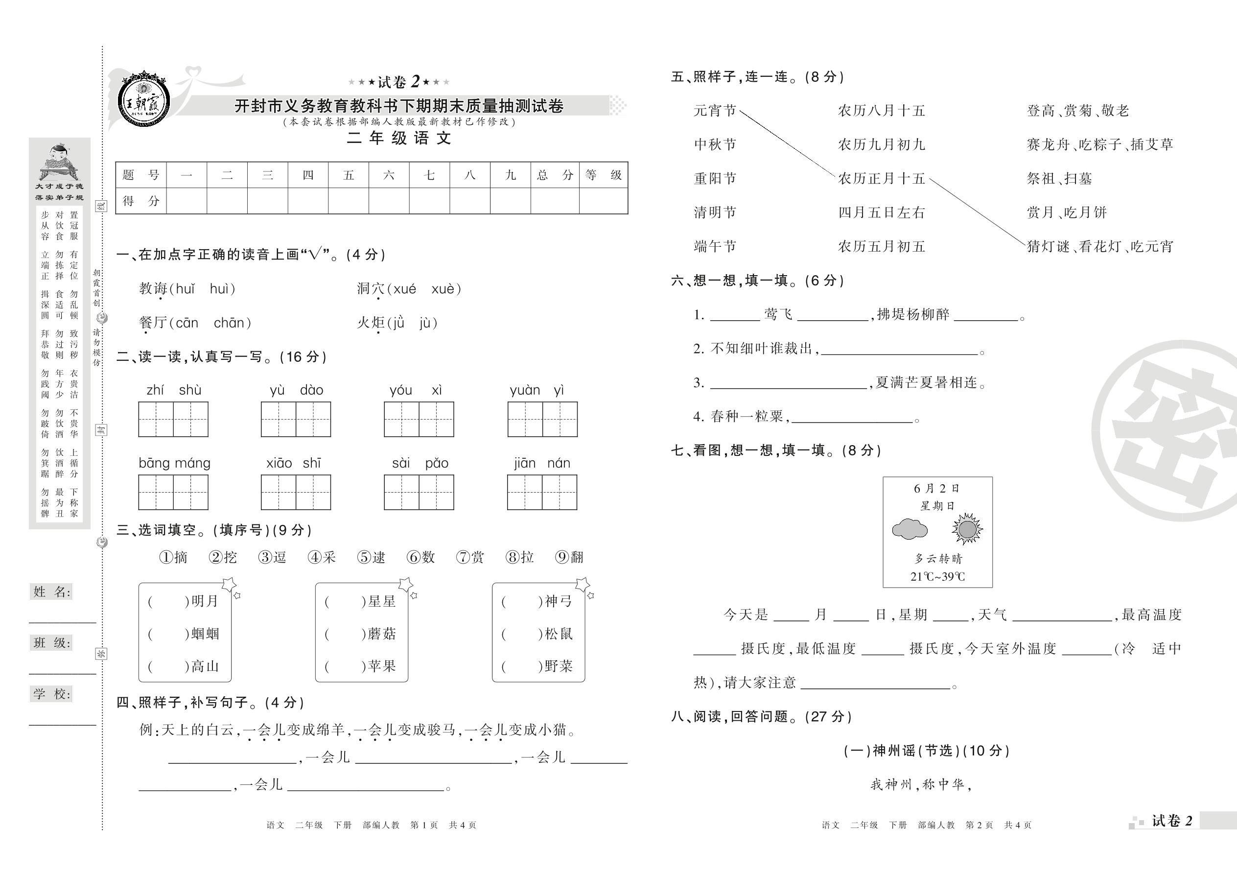 二年级语文人教版下册期末卷