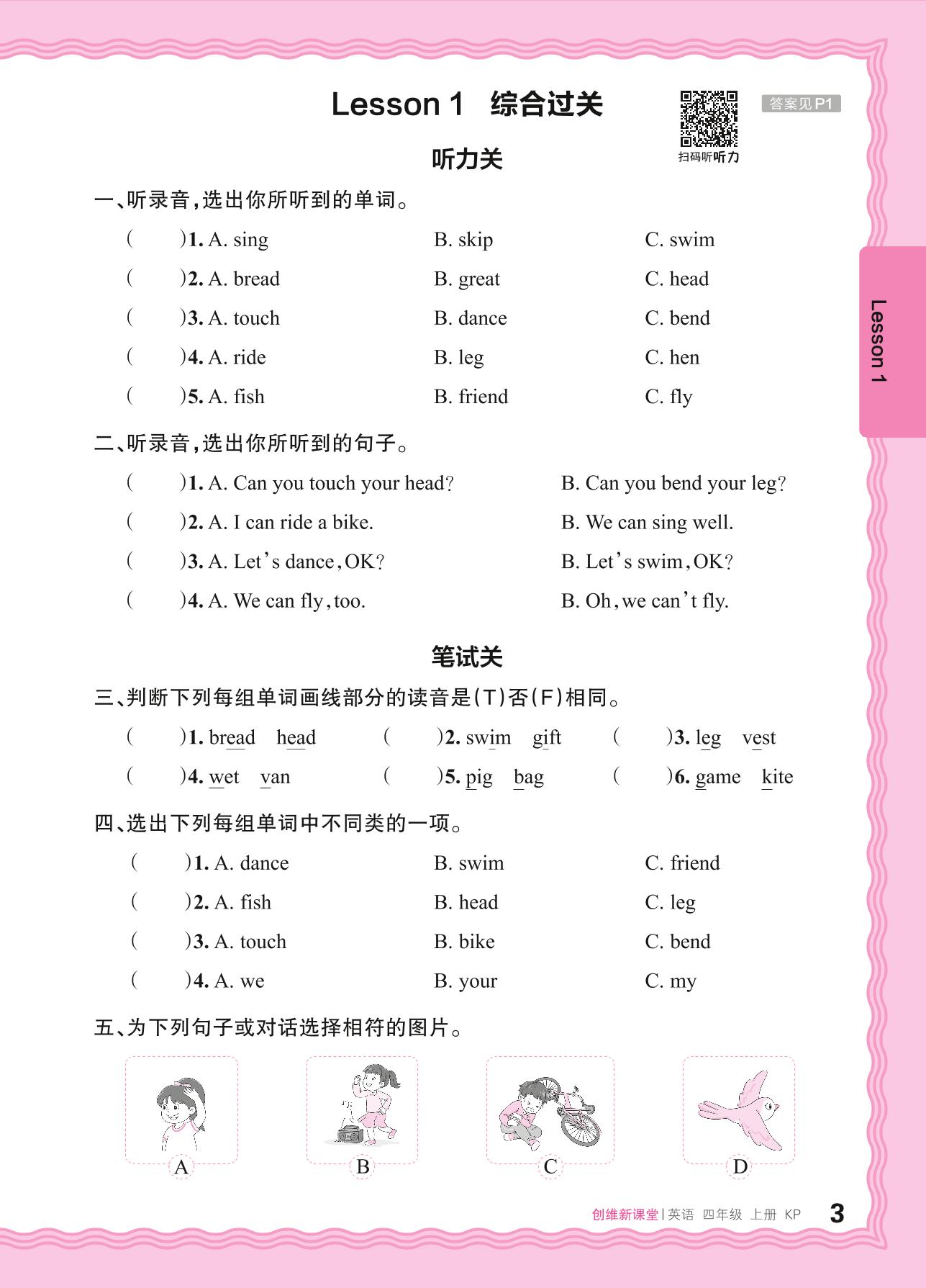 2024秋上册四年级英语科普版 Lesson 1 We can dance.综合过关