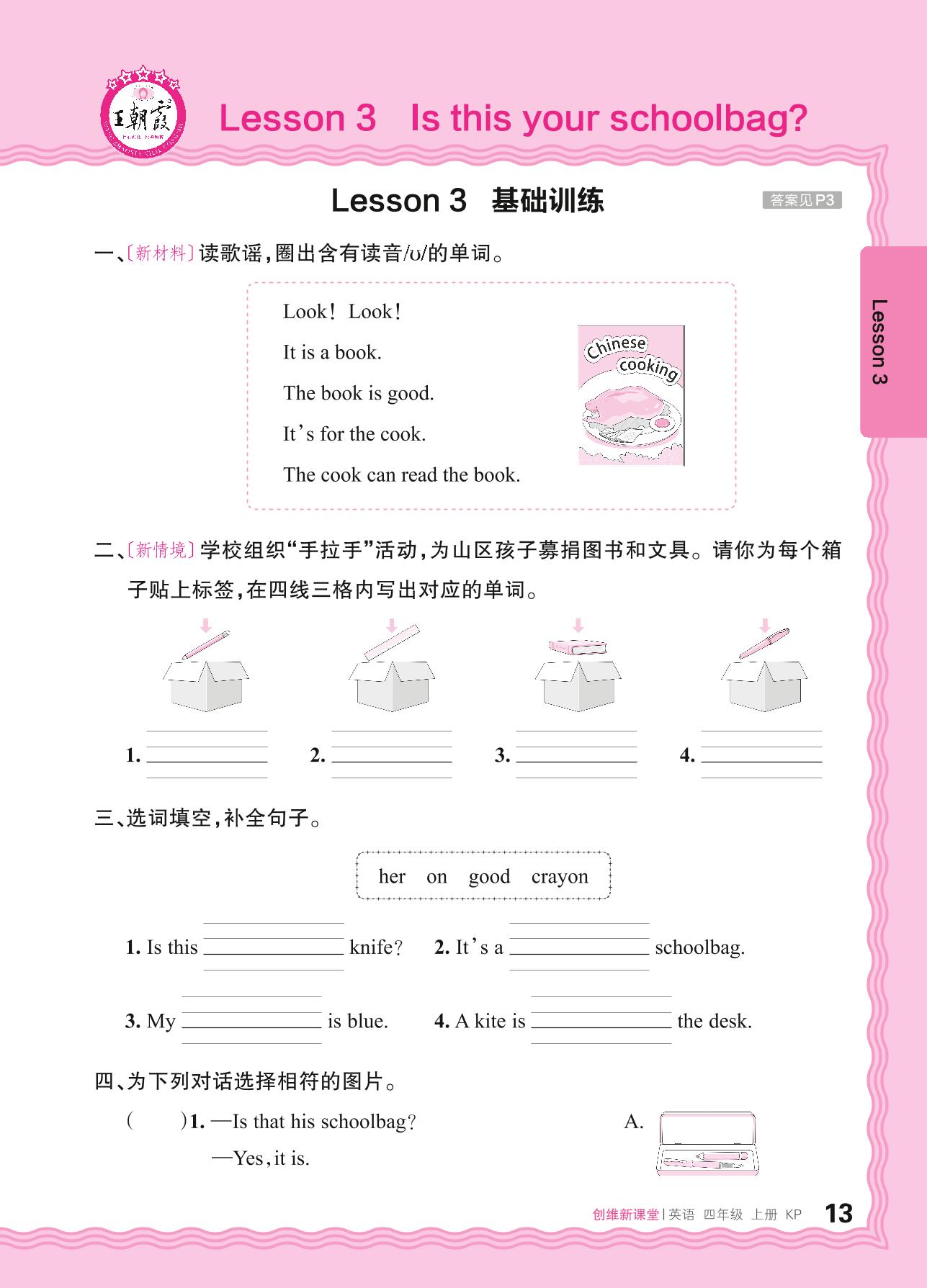 2024秋上册四年级英语科普版 Lesson 3 Is this your schoolbag?基础训练
