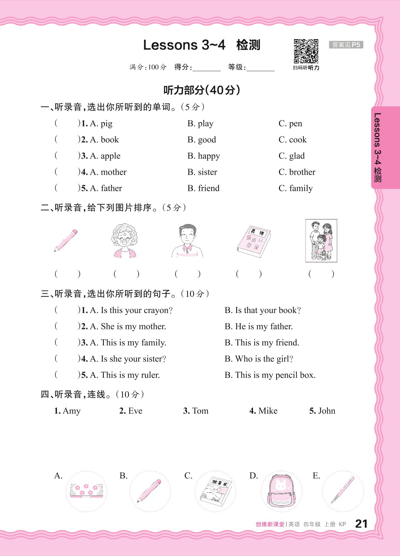 2024秋上册四年级英语科普版 Lessons 3~4 检测