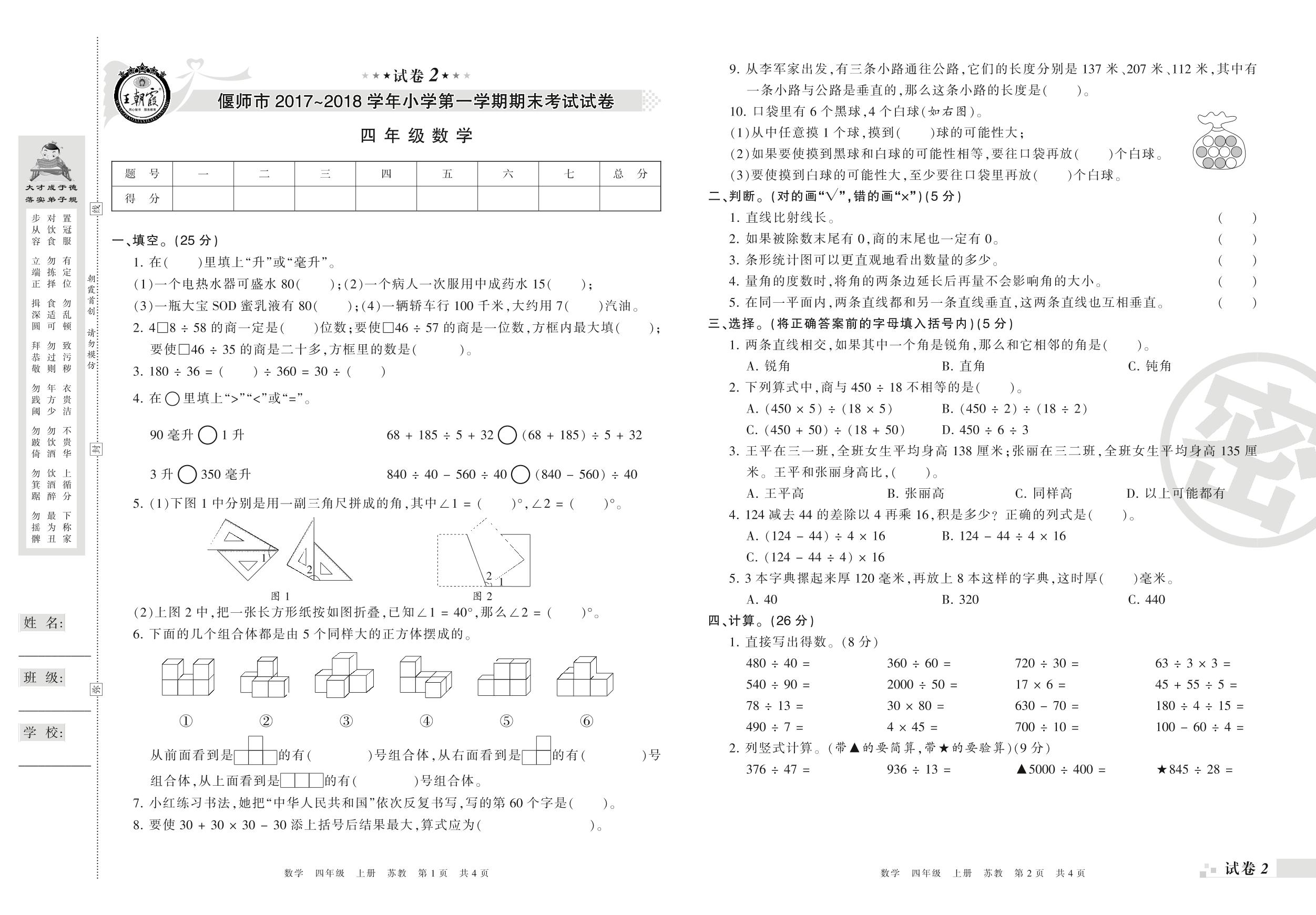 2017-2018学年第一学期偃师市四年级数学试卷(苏教版)【2】