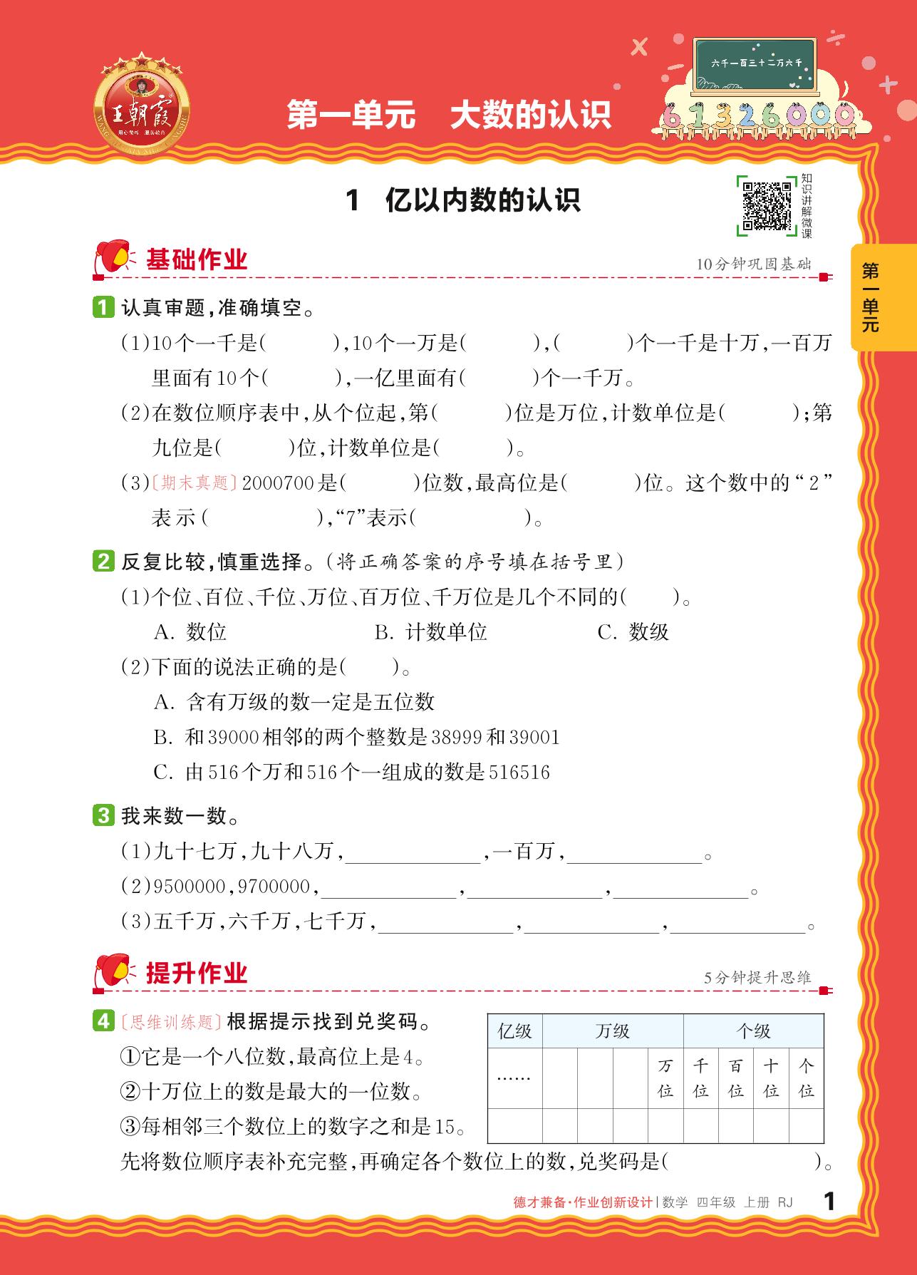 2024秋上册四年级数学人教版 第一单元 大数的认识——1. 亿以内数的认识
