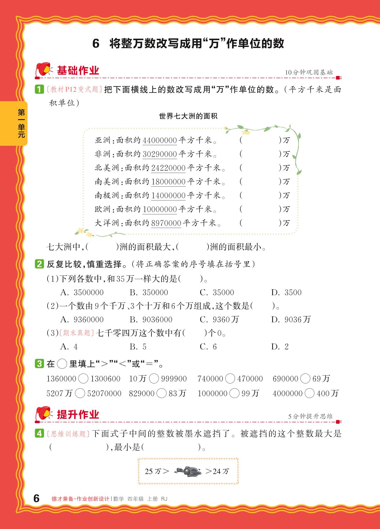 2024秋上册四年级数学人教版 第一单元 大数的认识——6. 将整万数改写成用“万”作单位的数