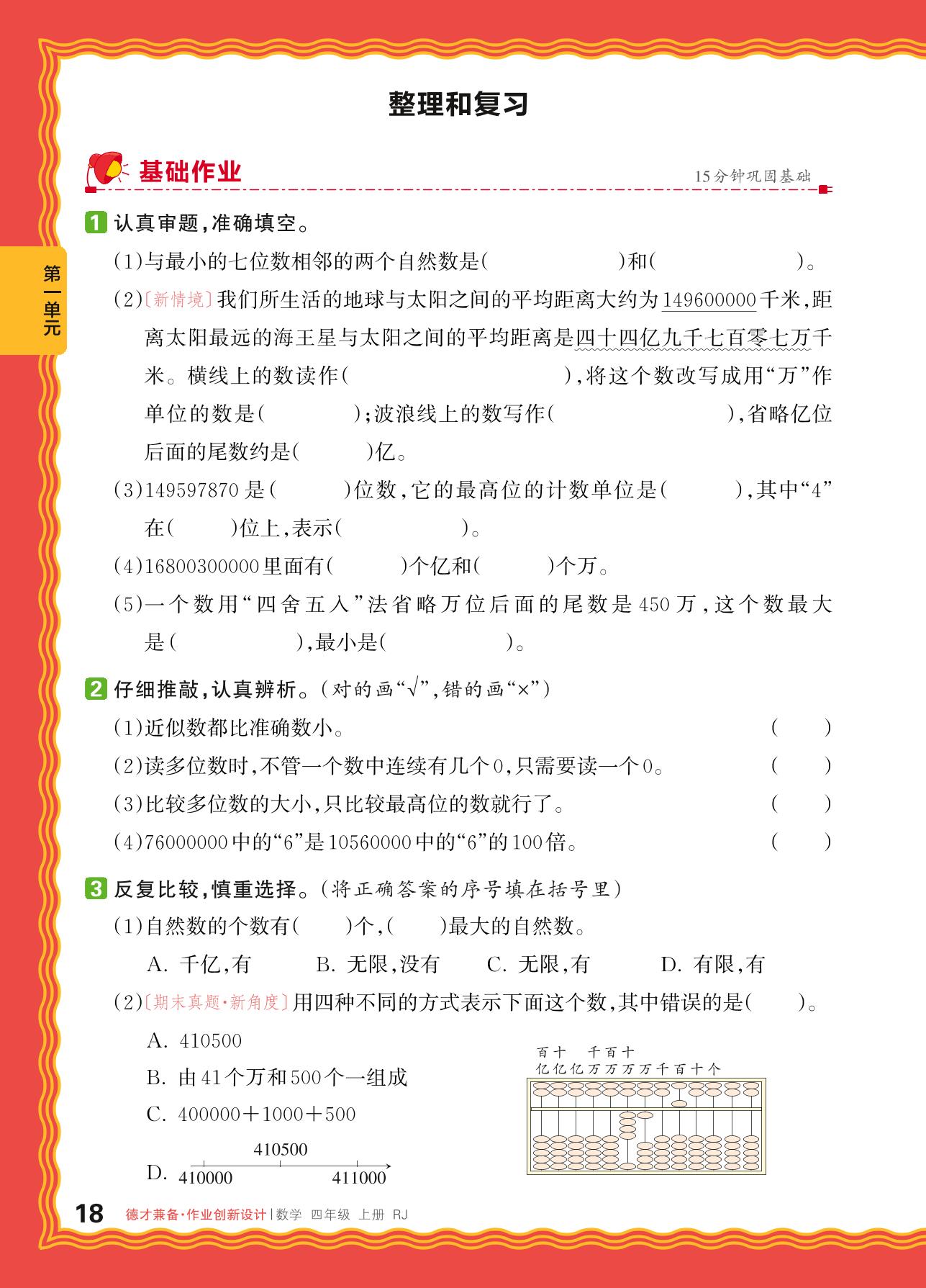 2024秋上册四年级数学人教版 第一单元 大数的认识——整理和复习