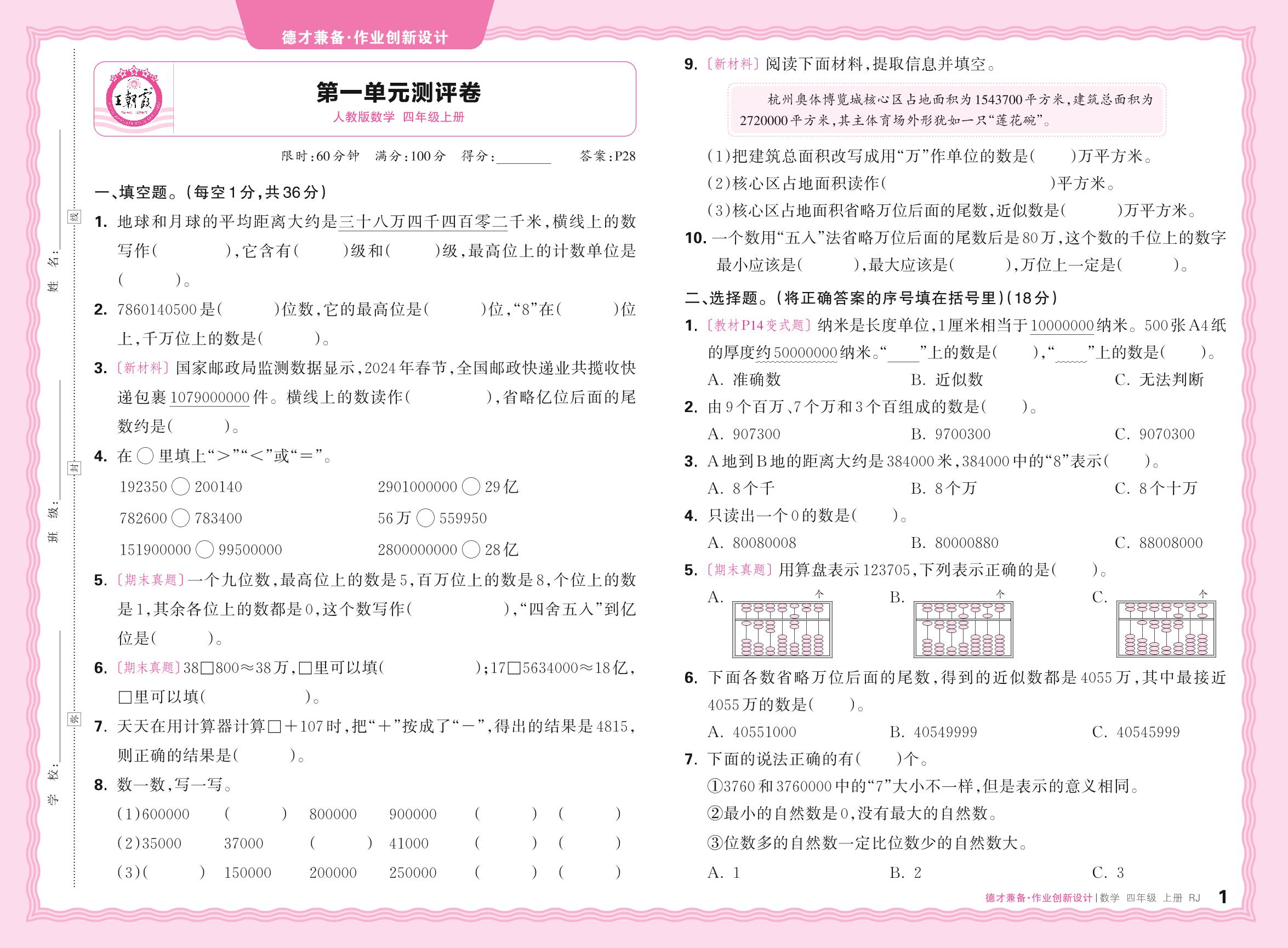 四年级数学人教版上册单元卷