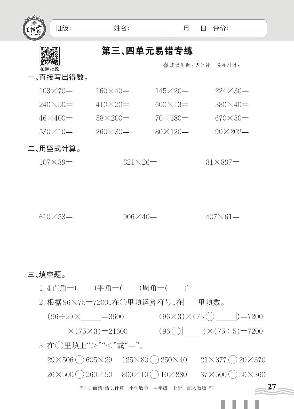 2024秋上册四年级数学人教版 第三、四单元易错专练