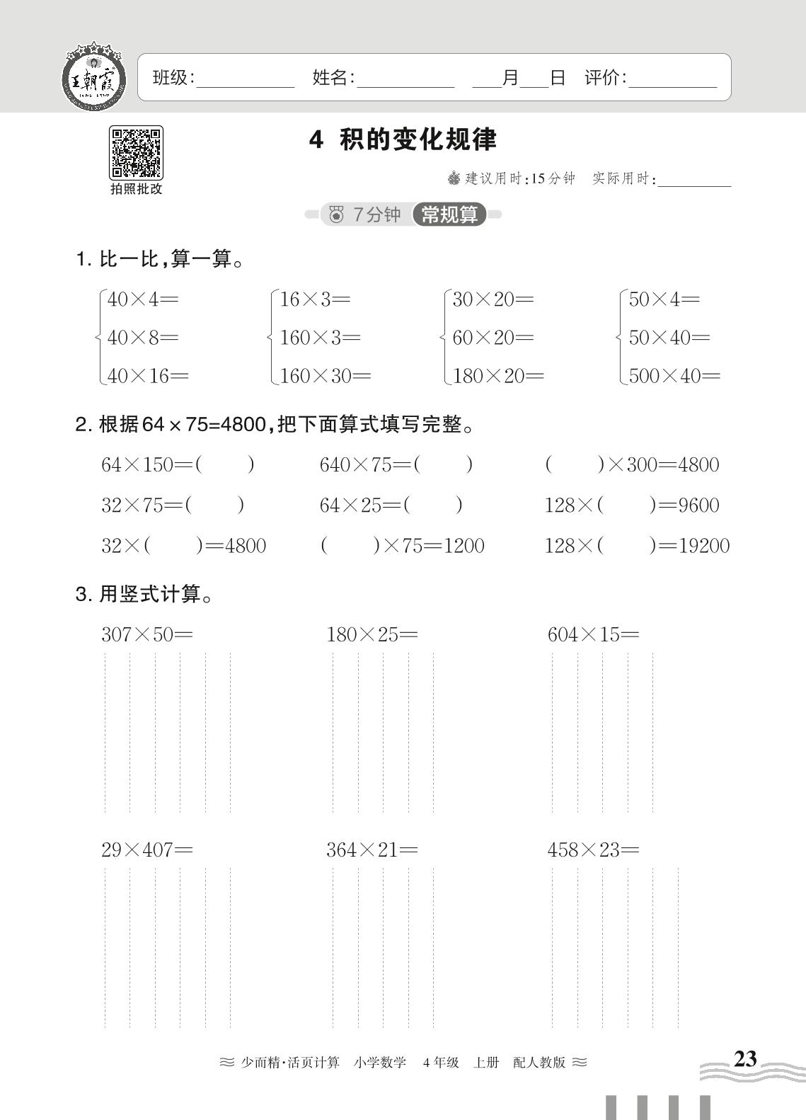 2024秋上册四年级数学人教版 第四单元 三位数乘两位数——4. 积的变化规律