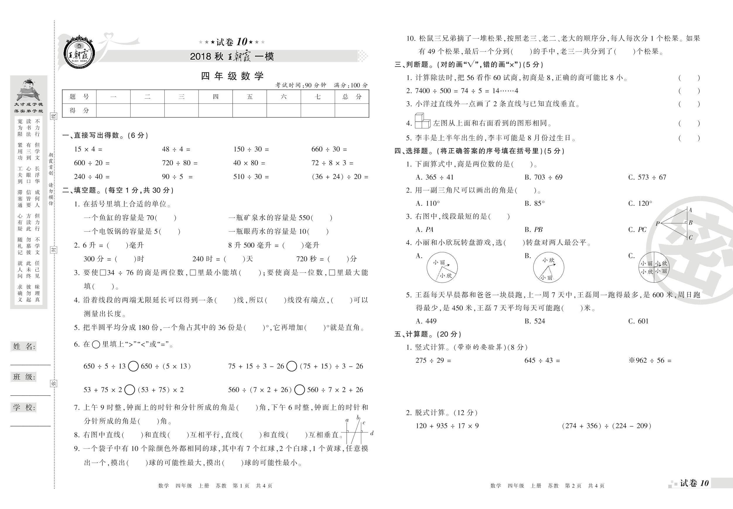 王朝霞期末模拟卷四年级上册数学(苏教版)_R210804155132【10】
