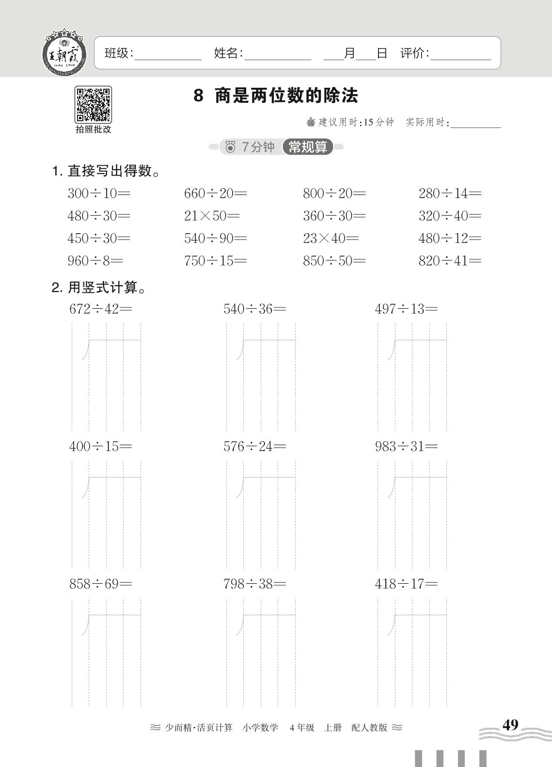 2024秋上册四年级数学人教版 第六单元 除数是两位数的除法——8. 商是两位数的除法