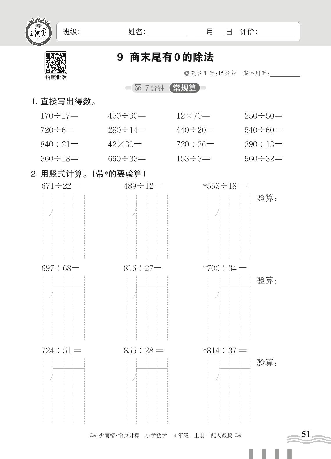 2024秋上册四年级数学人教版 第六单元 除数是两位数的除法——9. 商末尾有0的除法