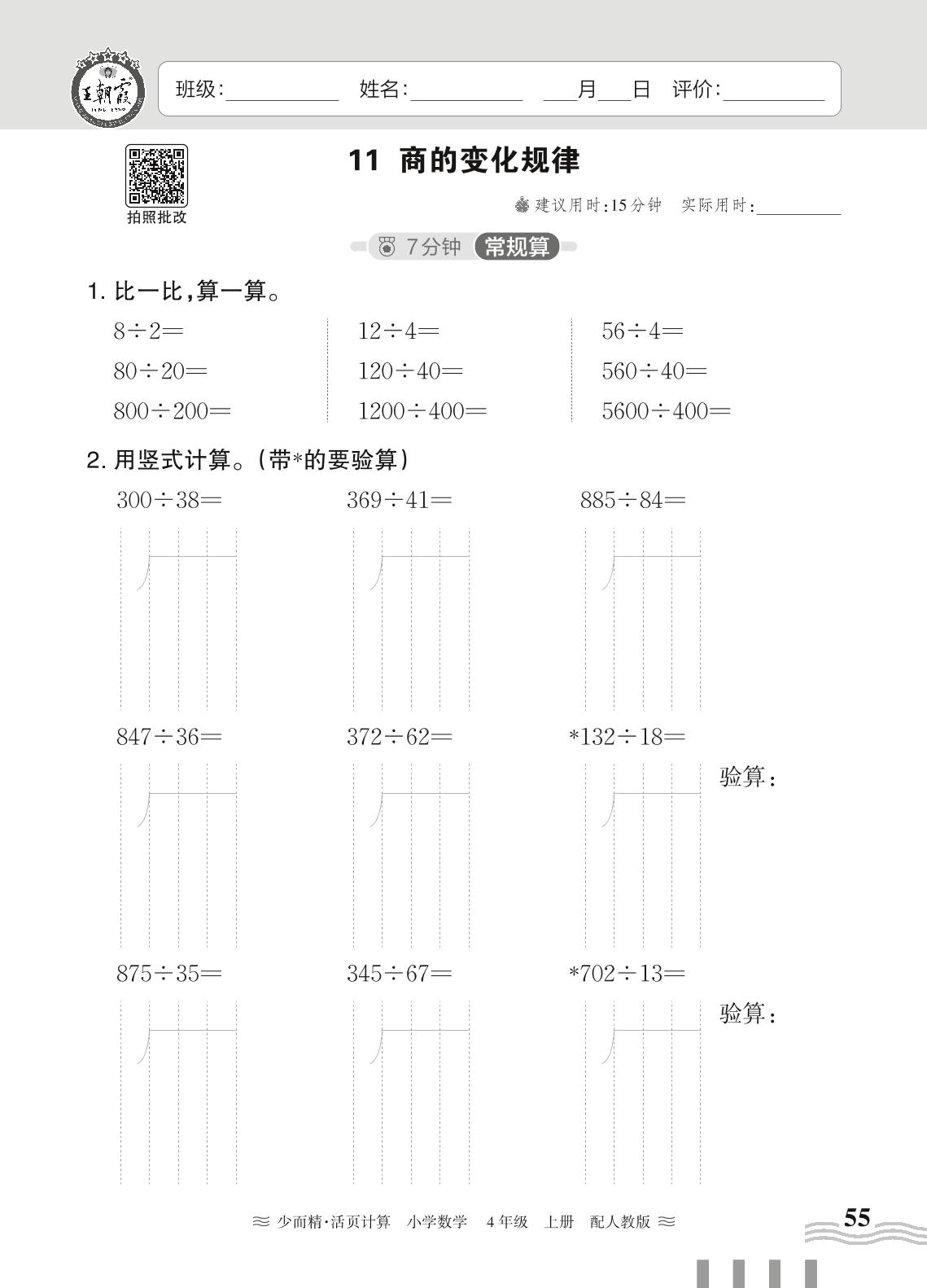 2024秋上册四年级数学人教版 第六单元 除数是两位数的除法——11. 商的变化规律