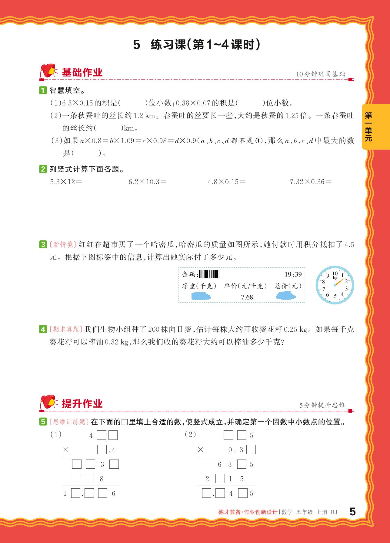 2024秋上册五年级数学人教版 第一单元 小数乘法——5. 小数乘整数、小数乘小数练习课