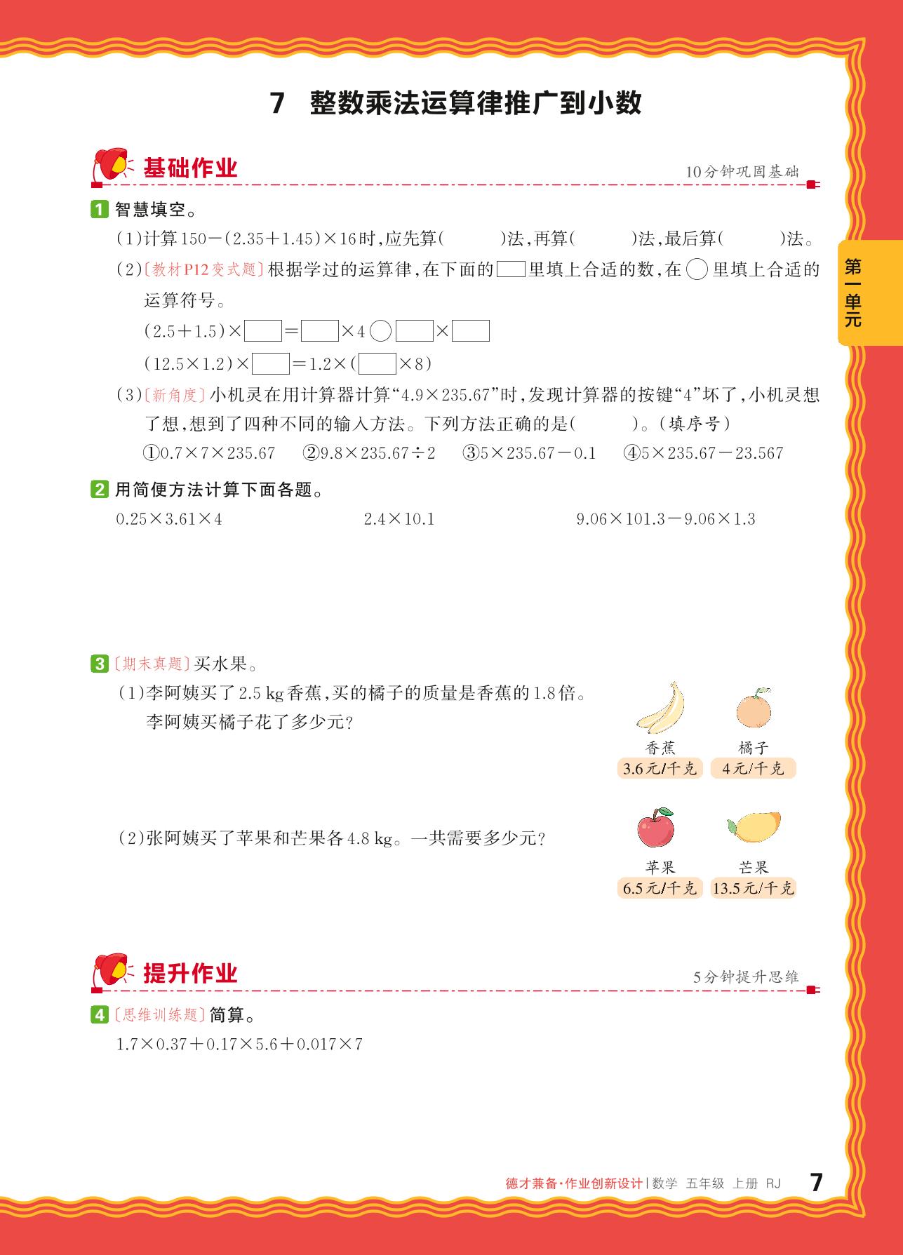 2024秋上册五年级数学人教版 第一单元 小数乘法——7. 整数乘法运算律推广到小数_R240819110211785