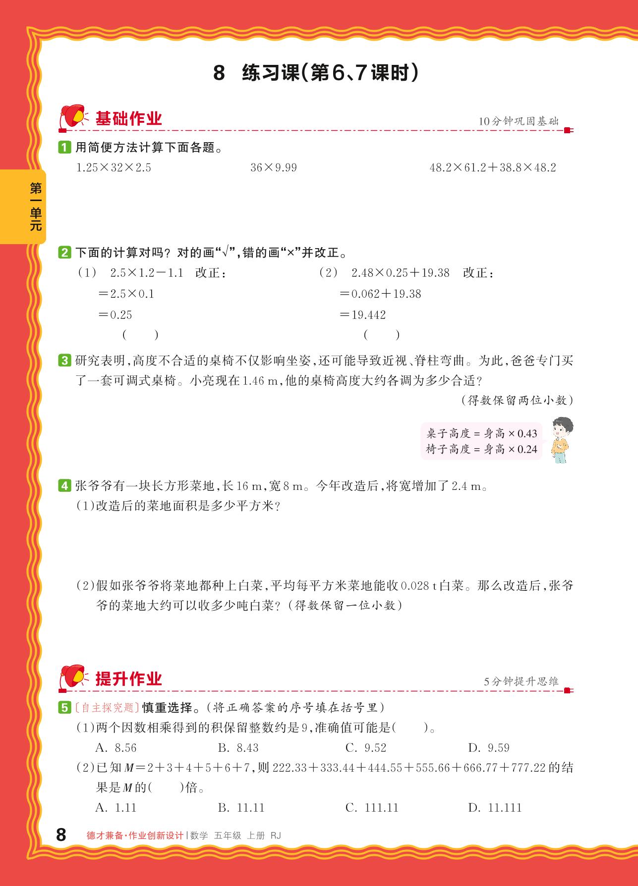 2024秋上册五年级数学人教版 第一单元 小数乘法——8. 积的近似数、整数乘法运算律推广到小数练习课