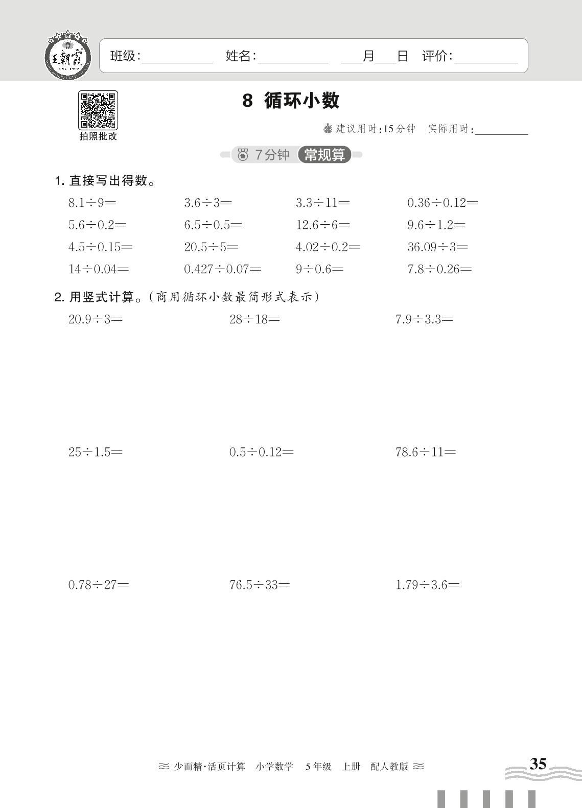 2024秋上册五年级数学人教版 第三单元 小数除法——8. 循环小数