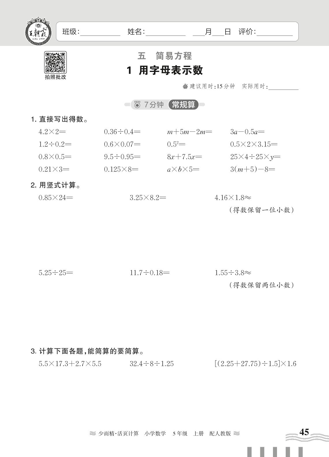 2024秋上册五年级数学人教版 第五单元 简易方程——1. 用字母表示数