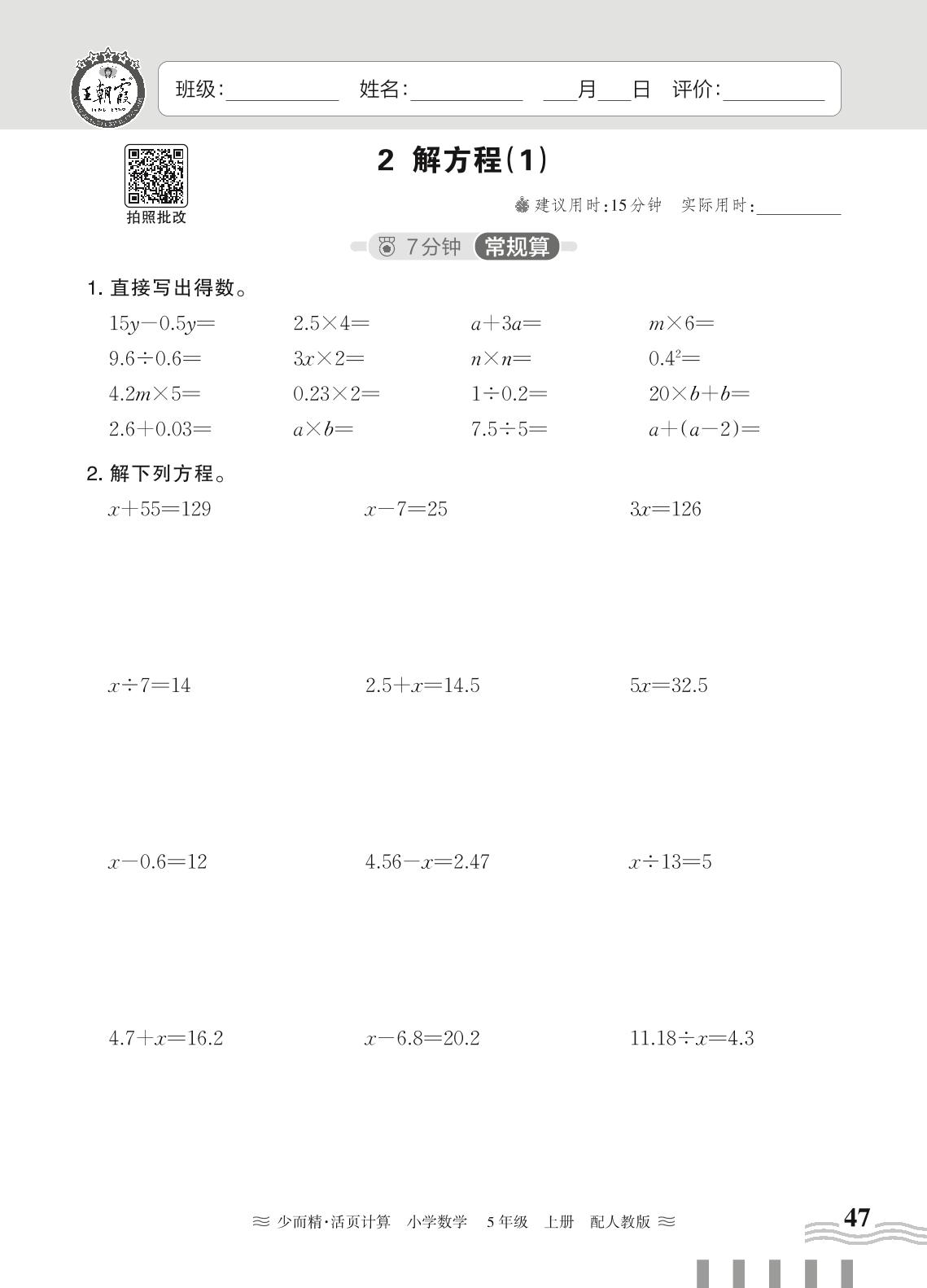 2024秋上册五年级数学人教版 第五单元 简易方程——2. 解方程(1)