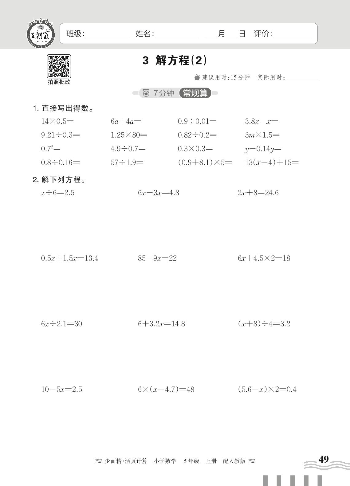 2024秋上册五年级数学人教版 第五单元 简易方程——3. 解方程(2)