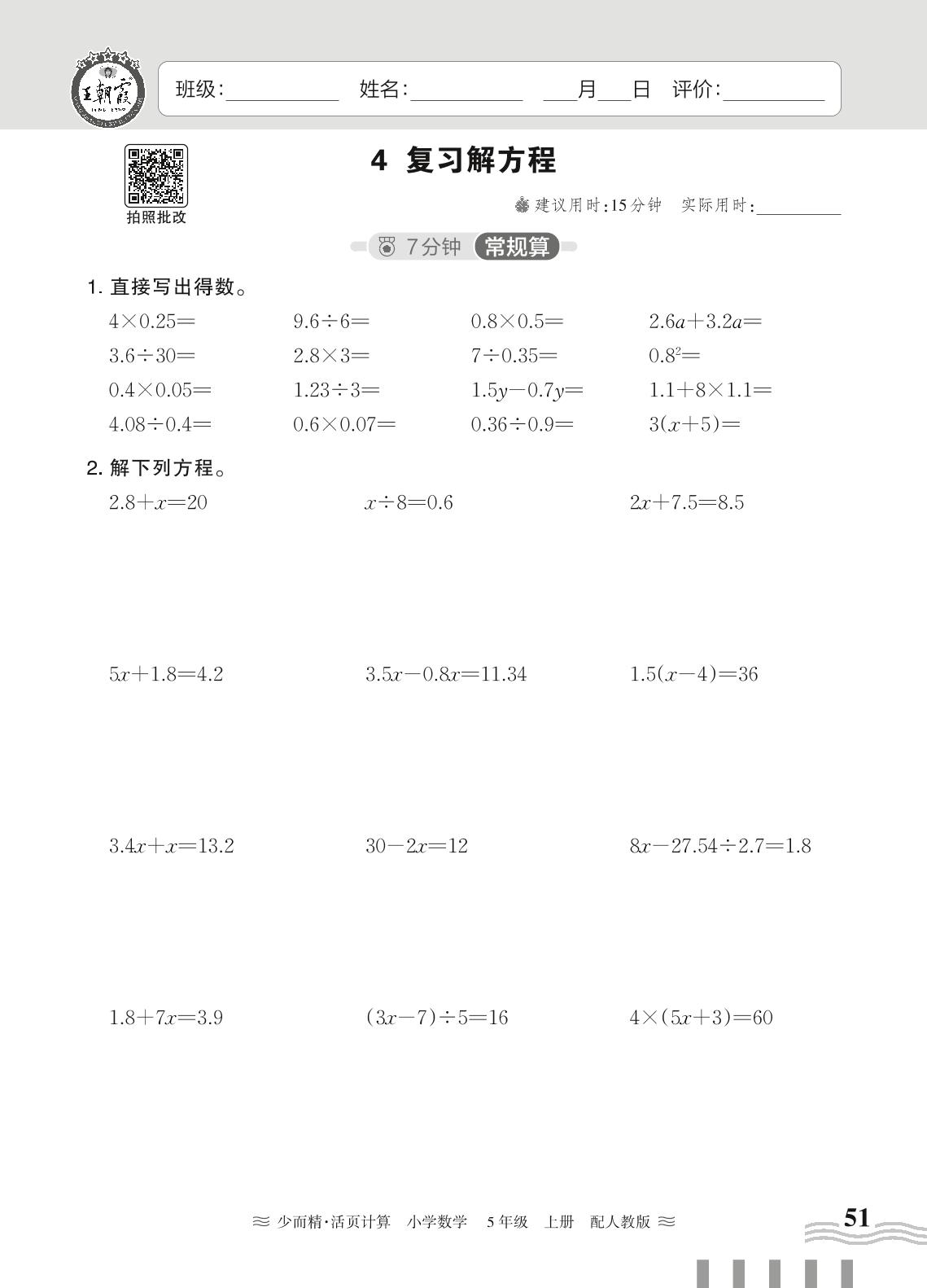 2024秋上册五年级数学人教版 第五单元 简易方程——4. 复习解方程