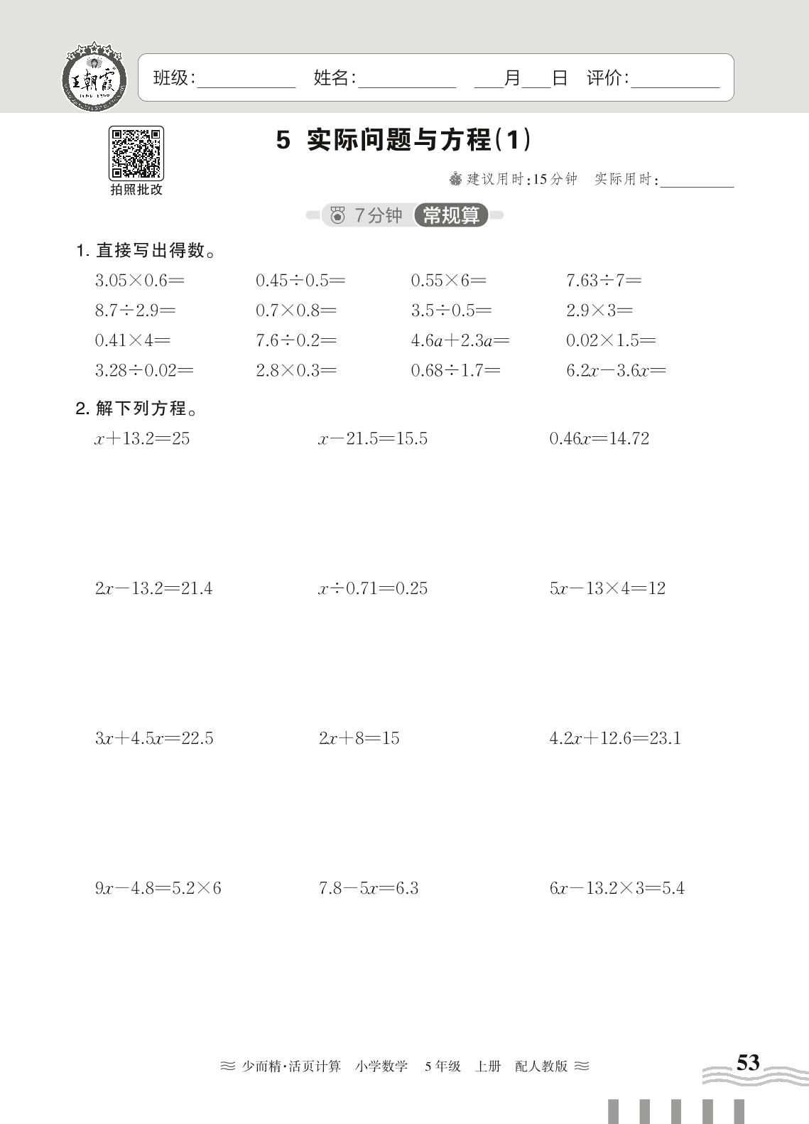 2024秋上册五年级数学人教版 第五单元 简易方程——5. 实际问题与方程(1)