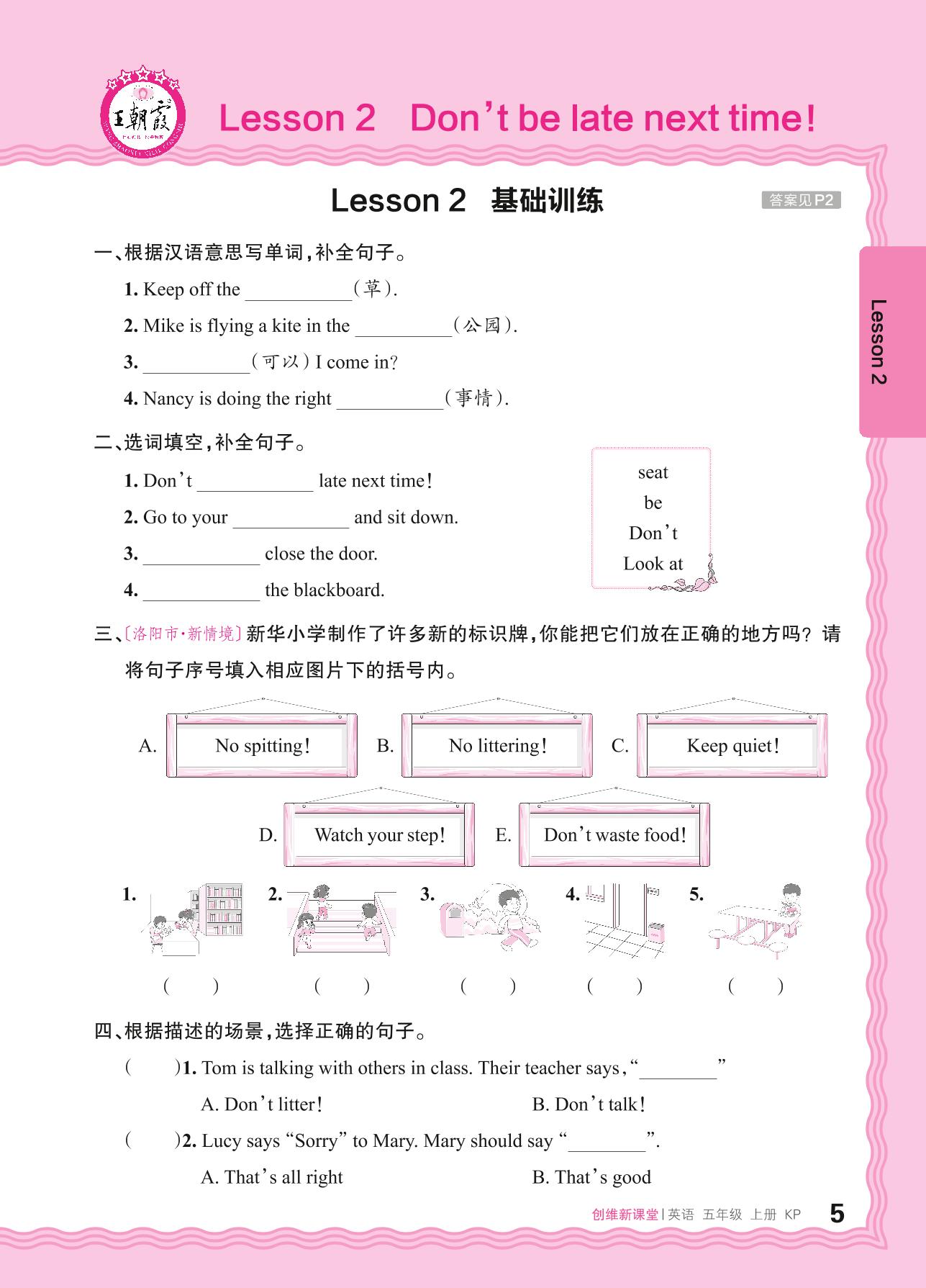 2024秋上册五年级英语科普版 Lesson 2 Don't be late next time!基础训练