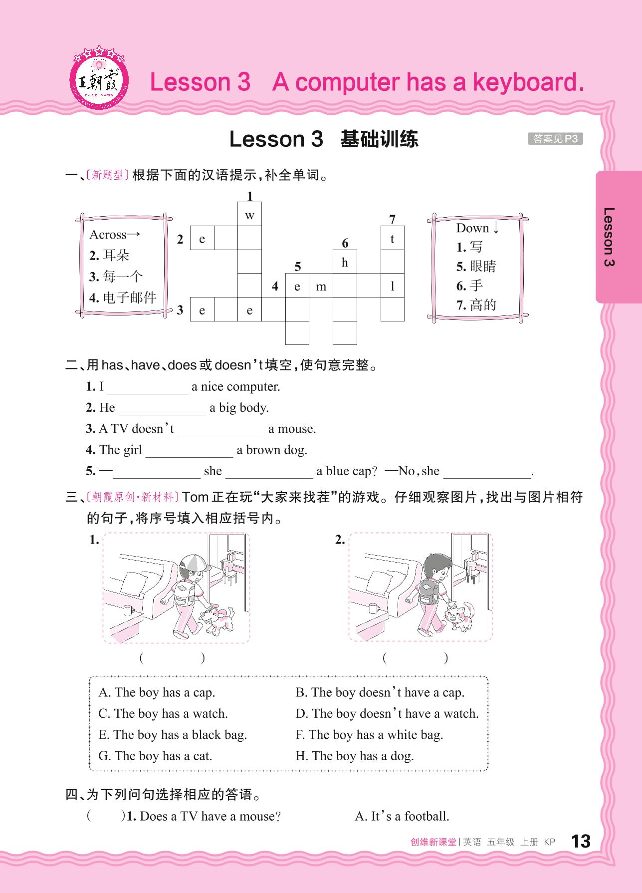 2024秋上册五年级英语科普版 Lesson 3 A computer has a keyboard.基础训练