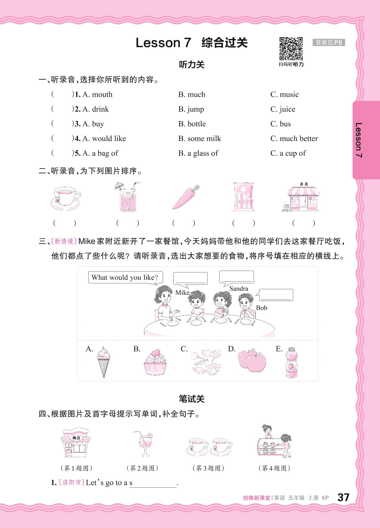 2024秋上册五年级英语科普版 Lesson 7 What would you like?综合过关