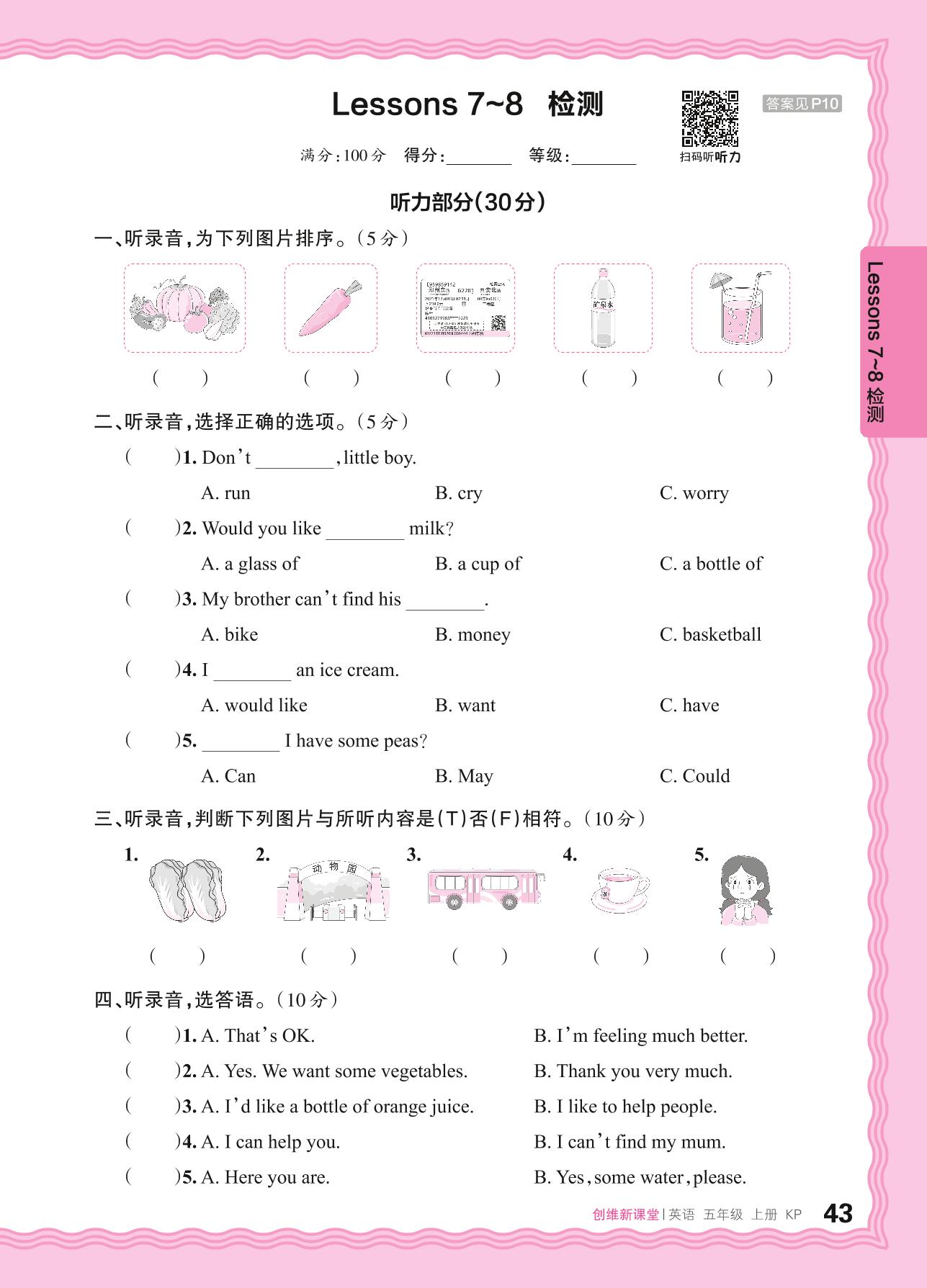2024秋上册五年级英语科普版 Lessons 7~8 检测